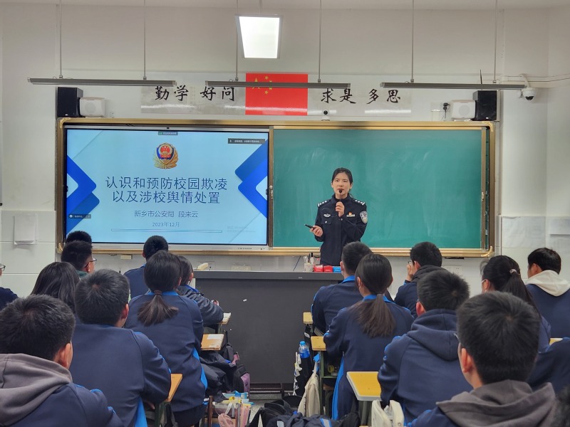 为深入贯彻落实《预防未成年人犯罪法》和《未成年人保护法》,提高未成年人思想道德水平和法律素质,让法治走进校园,进一步增强同学们的法律意识,自觉遵纪守法,做一名知法、守法的合格中学生。2023年12月4日下午,高中部高一年级邀请了新乡市公安局治安和出入境管理支队二级警长段来云警长,为学生们进行了一次权威生动的法制报告。