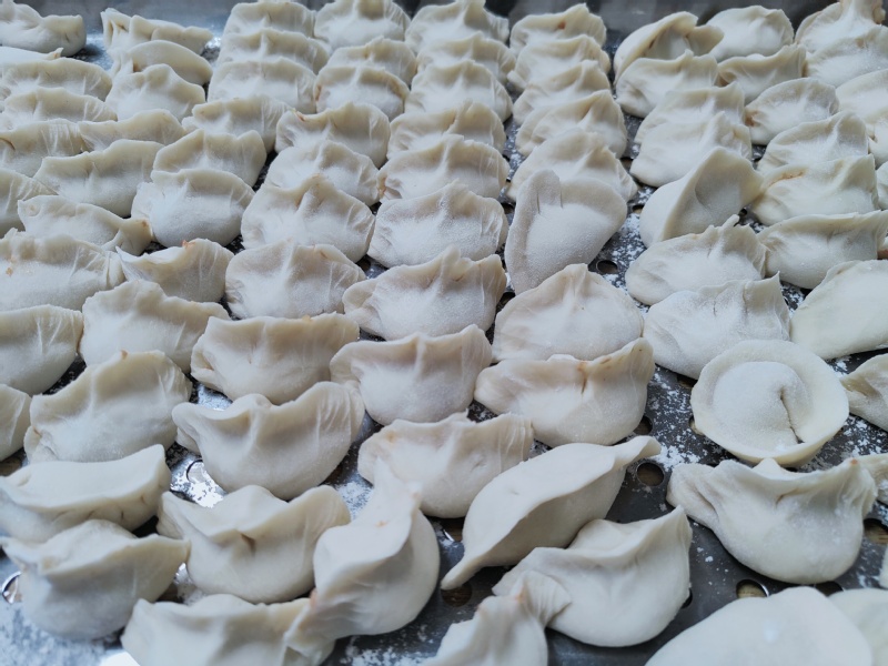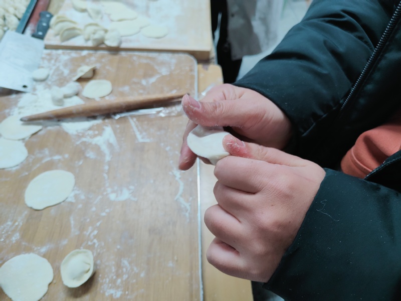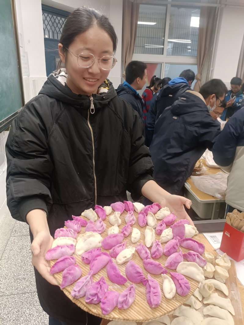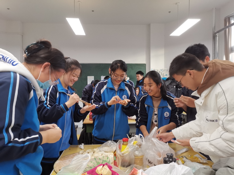 同学们分工协作,擀皮持面团,娴熟转面杖,托起饺子皮,包好饺子馅,一个个规整有型的饺子快速诞生。亦有手法生疏的同学,不甘示弱,在向“熟练工”们请教之后,大展想象力,包出了造型各异的饺子。欢声笑语回荡教室,同窗相伴可抵寒夜漫长。