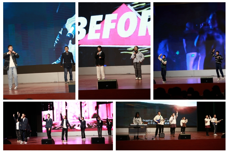 在英文歌曲串烧环节中,初二年级学生自编自导,将一首首经典的英文歌曲改变成优美、欢快、青春、动人的旋律,深深感染着在场师生,将活动不断推向高潮。