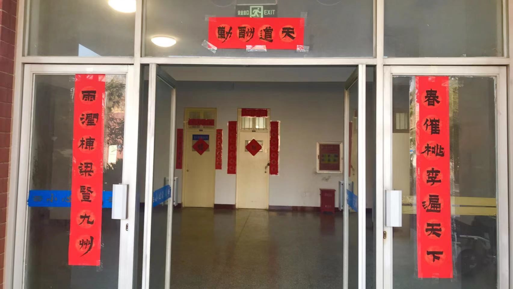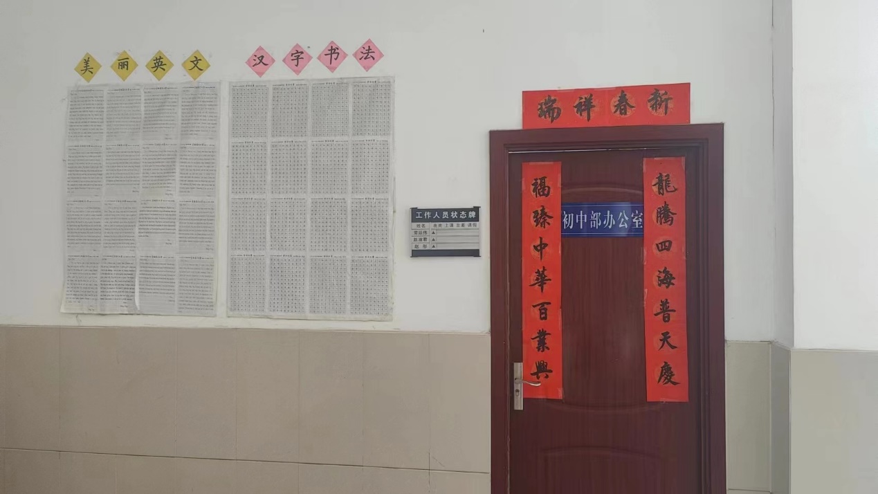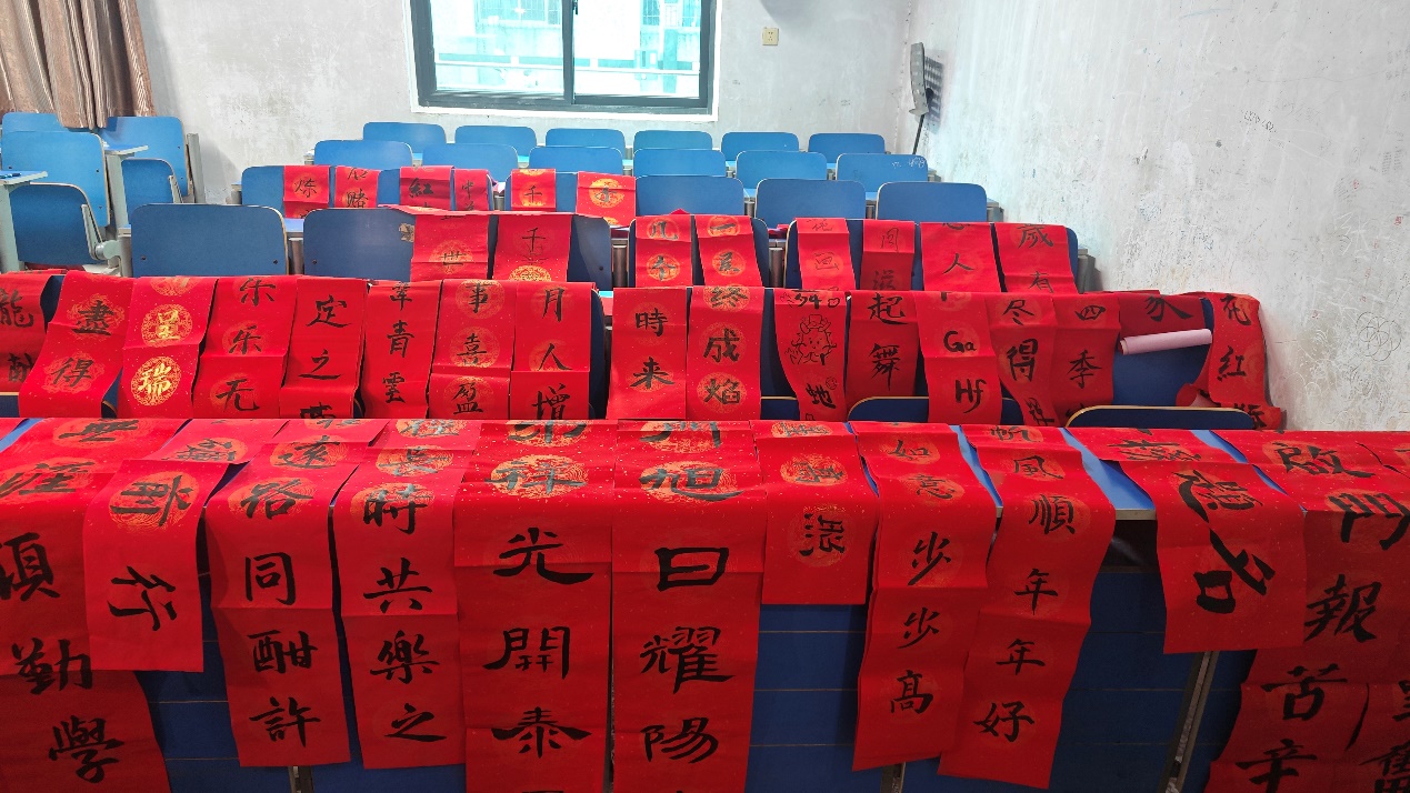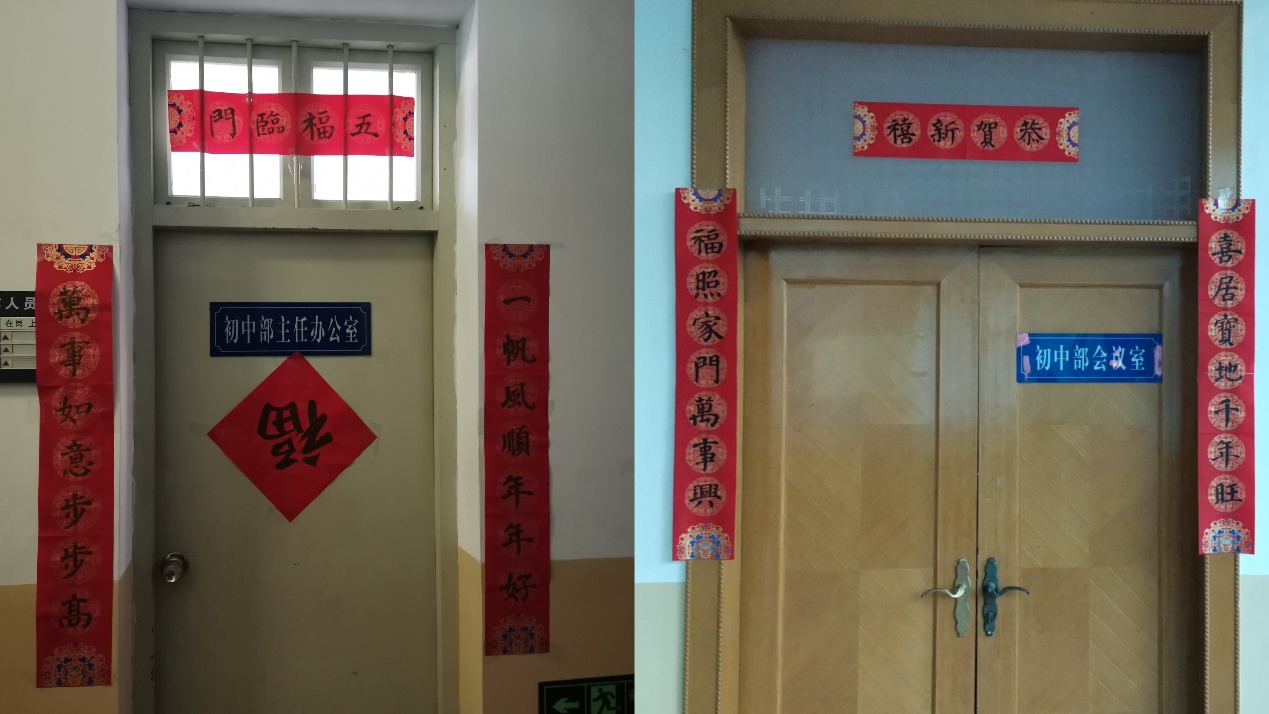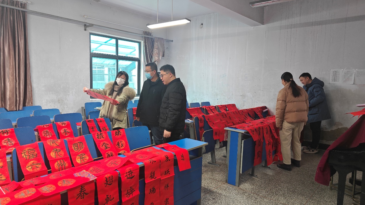 红幅铺展,一幅幅饱蘸浓墨、精美喜庆的对联装点着教室和办公室,洋溢着浓浓的年味。“龙年好运万事顺,家道昌隆百业兴”、“旧岁又添几个喜,新年更上一层楼”、“神州金龙蒙化雨,华夏娇子沐春风”等一幅幅寓意吉祥的春联,既满载着辞旧迎新的美好祝愿,又有对美好生活的期盼展望。