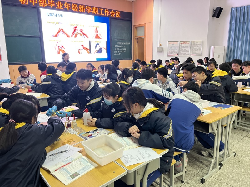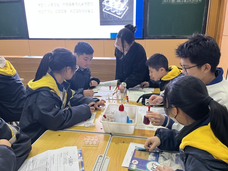 九年级理科展示课为张馨丹老师的《酸、碱与指示剂的作用》。该课用非遗染色技术——扎染引入,融入酸、碱在与指示剂发生化学反应时出现的一些颜色变化,带领学生体会扎染的魅力。充分发挥了学生的主体性,学生全程以小组形式动手实验,通过观察实验现象,小组讨论总结得出实验结论。课上反应良好,学生与老师之间配合度高,环节设计合理,将化学知识与非遗文化巧妙结合,学生通过本节课的化学学习体会到了中国文化的博大精深。
