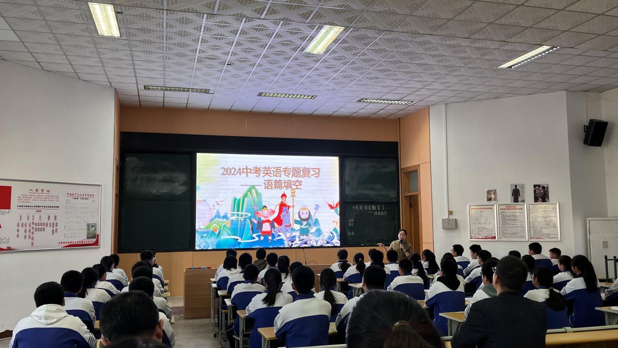 郭琳琳老师执教的《2024中考英语专题复习——语篇填空》一课,以孙悟空的相关英文短片作为课堂导入,将学生的学习过程比作孙悟空西天取经的过程,自然而然的将学生带入人物角色,师生一同踏上了求取“学习真经”的旅程。在求取“学习真经”的过程中遇到了动词、名词、形容词、数词、人称代词、介词等不同的挑战,学生逐步复习了形容词变比较级和最高级、动词变三单、名词变复数等相关语法规则,然后通过选词填空和盲填两篇练习进一步复习巩固学生的知识掌握情况。最后以学生日常学习生活的纪录片作为课堂的结尾,鼓励学生将本节课所取得的“学习真经”运用到中考百天冲刺中来,鼓励学生在复习基础知识的基础之上掌握一定的学习策略,鼓励学生像孙悟空一样不畏艰辛,不言失败,一鼓作气,最终在中考这场无声的战役中拔得头筹。