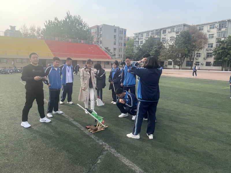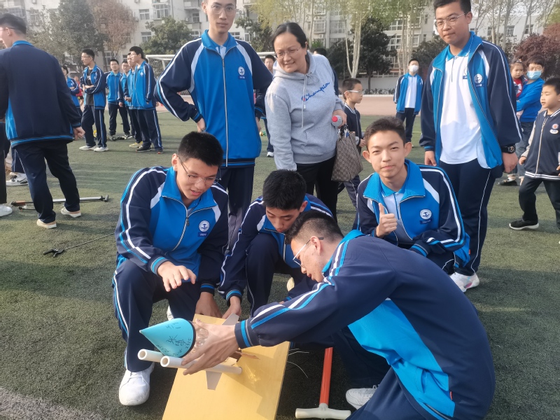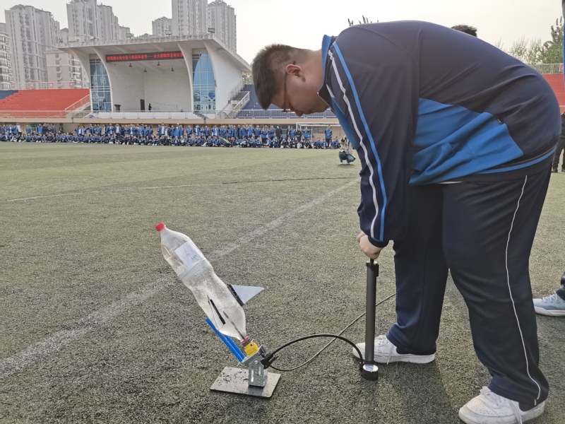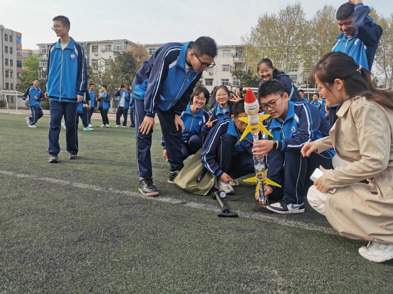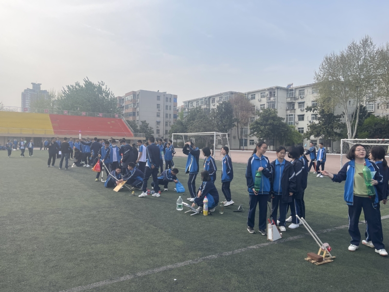 4月9日下午,阳光明媚,春风拂面,作为河南师大附中第十四届科技节的一大亮点,我校高中部高一年级迎来了一个充满创意与挑战的科学盛会——水火箭比赛。同学们亲手制作的水火箭,在天空中划出一道道美丽的弧线。