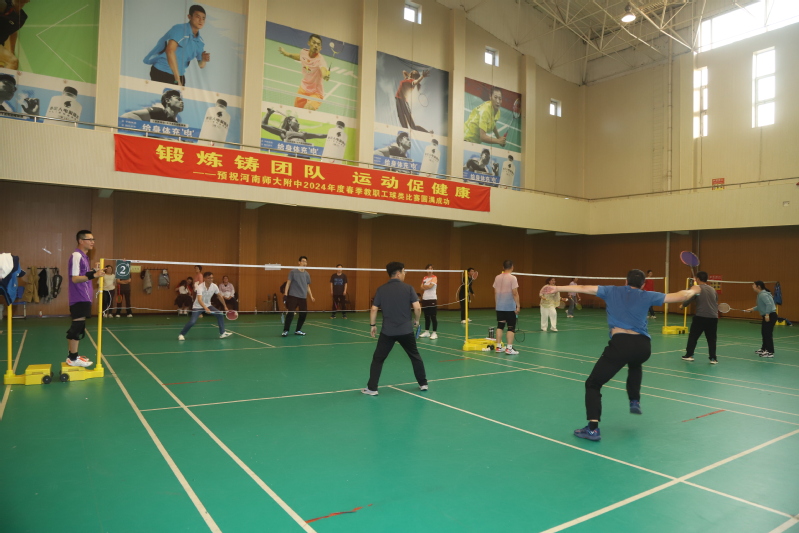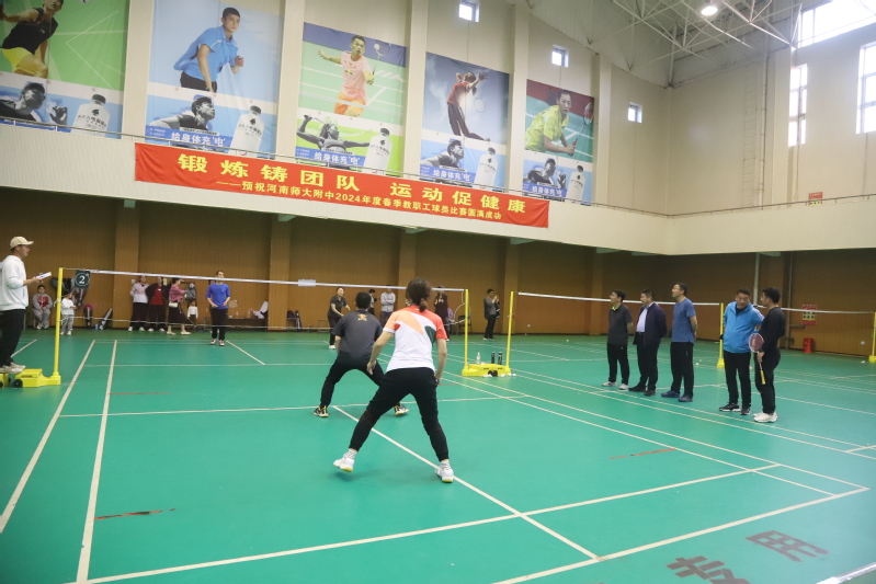 羽毛球场上,激情跃动,教职工羽毛球赛激战正酣。各分工会会员两两联手,形成男双、女双、混双等不同搭档,默契配合。小小场地,羽球翻飞,一场场比赛赏心悦目,扣人心弦,队员拼尽全力每分必争,旁边的观众啦啦队叫好声不断,共同展现出我校教职工勇于拼搏的精神风貌。