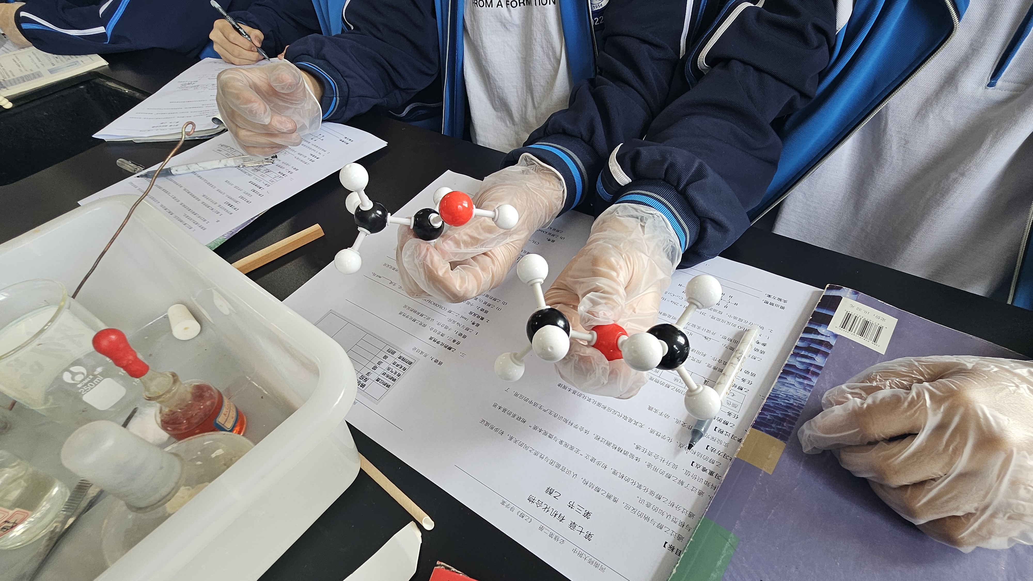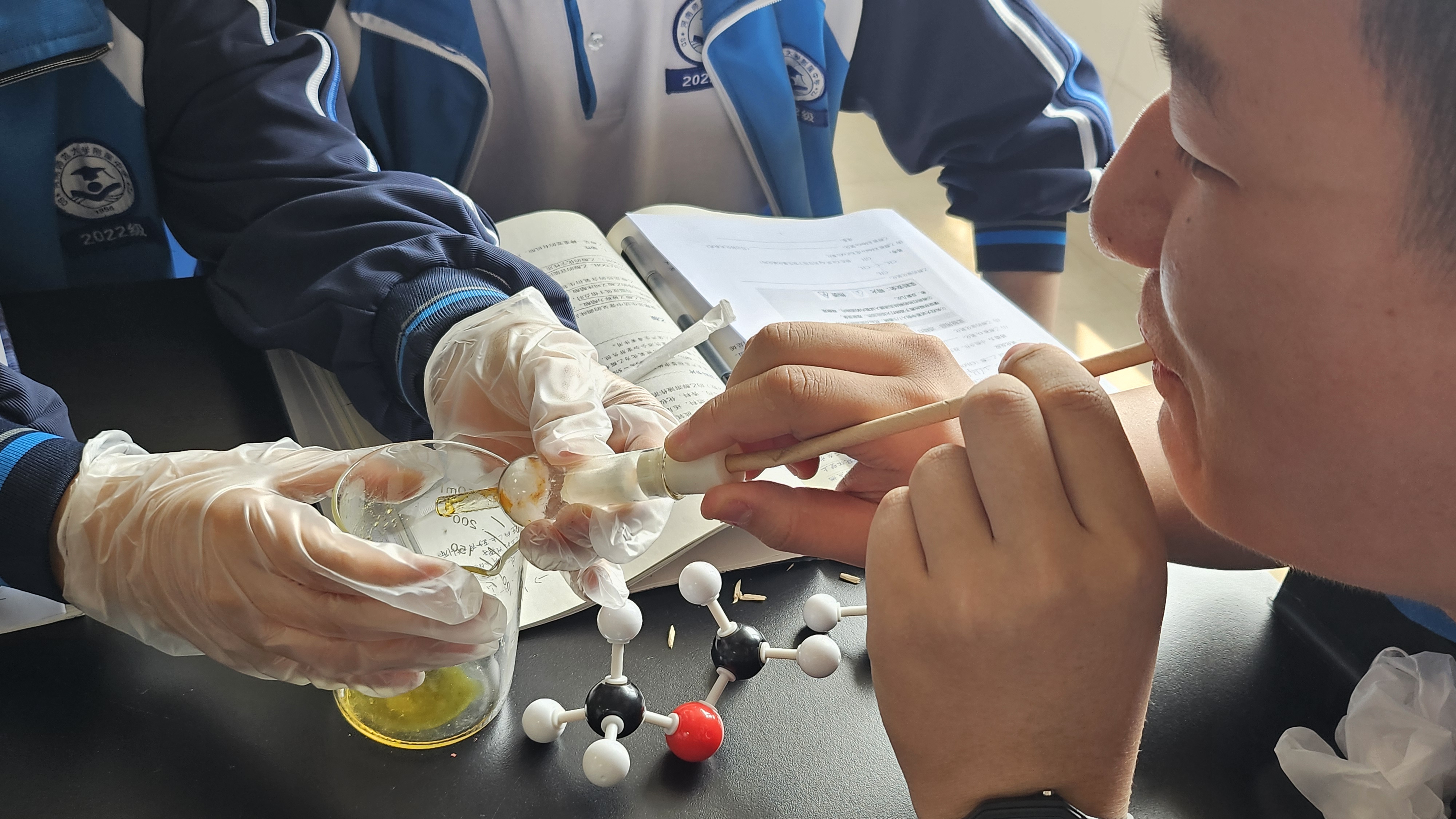 杨倩老师以含有“酒”字的飞花令为导入,带领学生从诗歌长廊步入乙醇的世界。课堂中,杨倩老师通过丰富的活动,带领学生自主探究:根据导学案自学探索乙醇性质;小组讨论、小组展示共学乙醇分子结构;动手实验、以食实践的乐学乙醇的催化反应及酒精检测原理;习题固学,通过课堂测试,巩固学生学习成果。