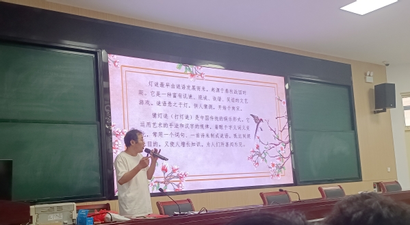 讲座伊始,路老师给同学们普及了灯谜的概念、由来传说、发展演变和名词术语、结构规则、猜制方法技巧等基础知识,带领同学们进行了一些简单的民间谜语赏析。同学们认真听讲,积极与老师互动,努力理解和掌握灯谜的知识和技巧。