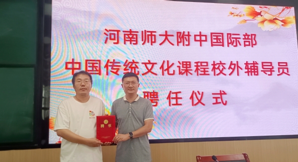 讲座开始前,国际部副主任周睿对此次活动做了简单介绍,并向路传昆老师颁发聘书,聘任路传昆老师为国际部中国传统文化课程校外辅导员。