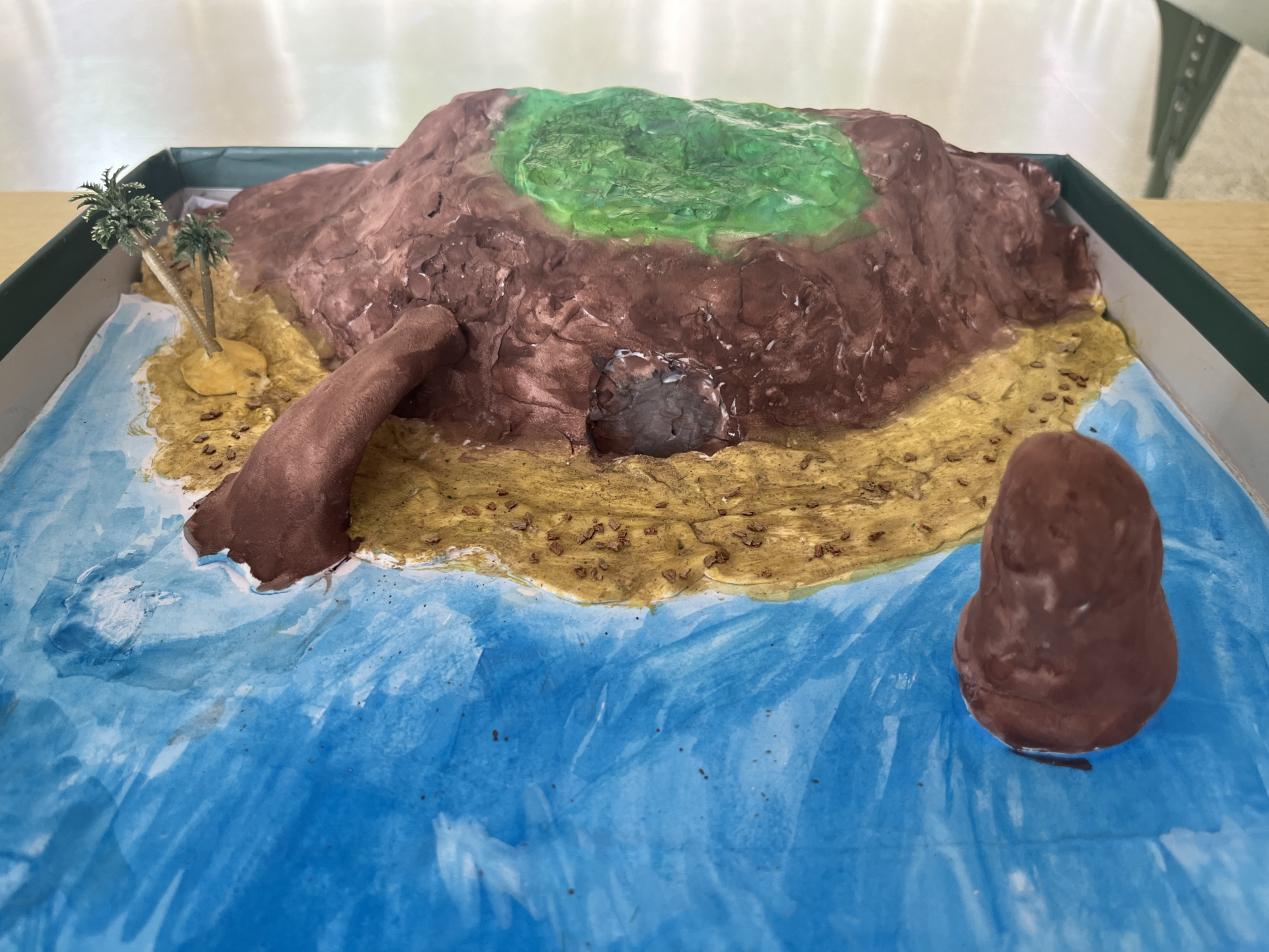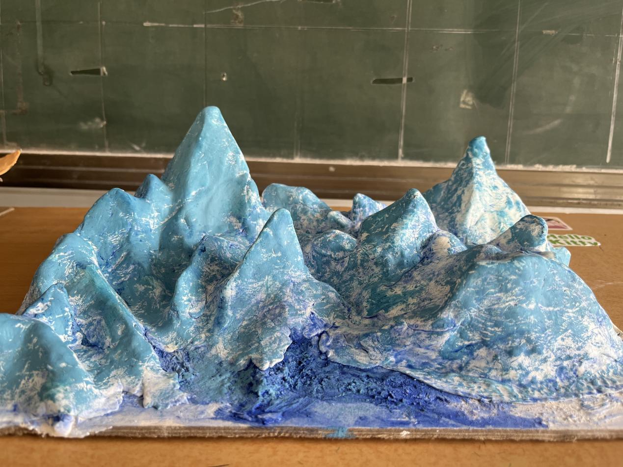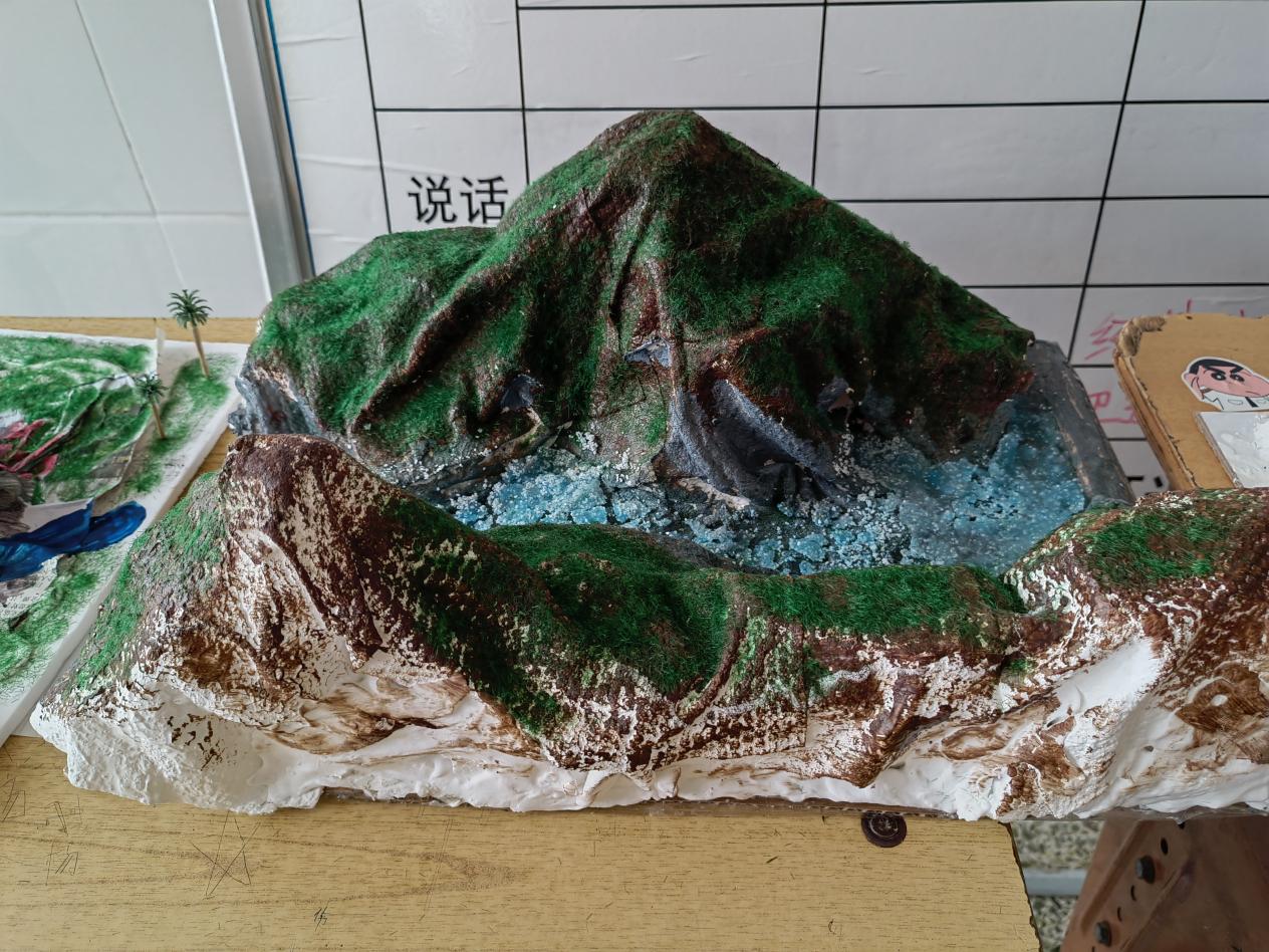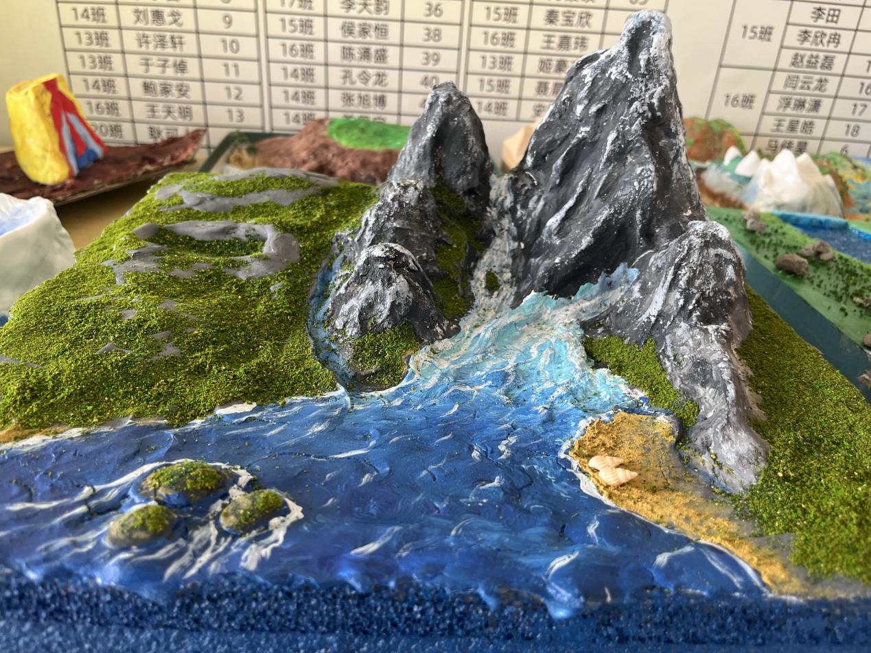 各班同学自由结队组成制作小组,纷纷发挥自己的想象力和创造力,用废旧纸箱、碎纸、超轻黏土、泡沫板、颜料等制成一个个独特的地貌模型。奇峰峻岭、江河湖海、峡谷溶洞、褶皱断层、火山喷发等一系列地形地貌在同学们的精心绘制之下,不仅在外观上栩栩如生,更是生动地再现了其特征和结构。