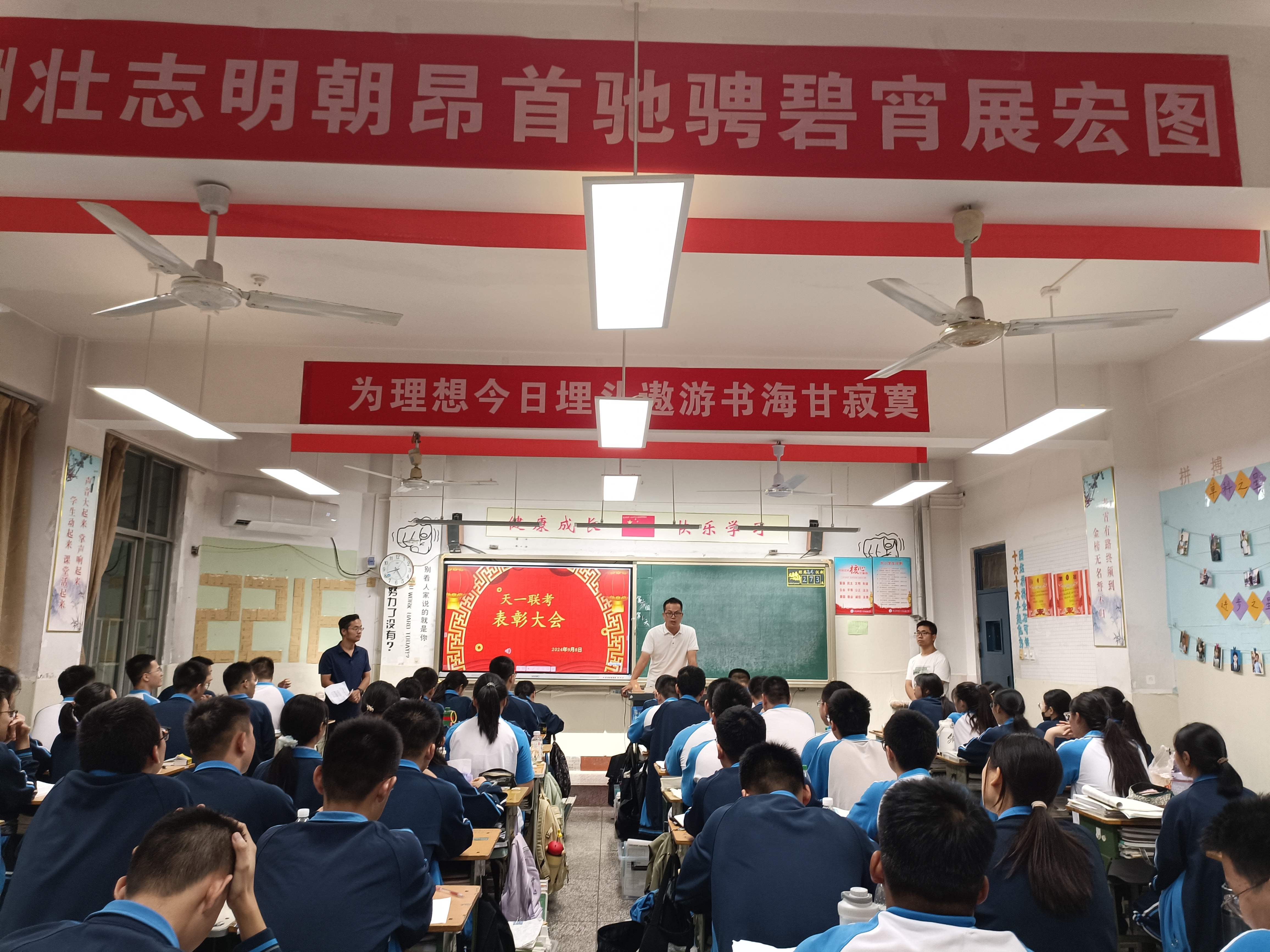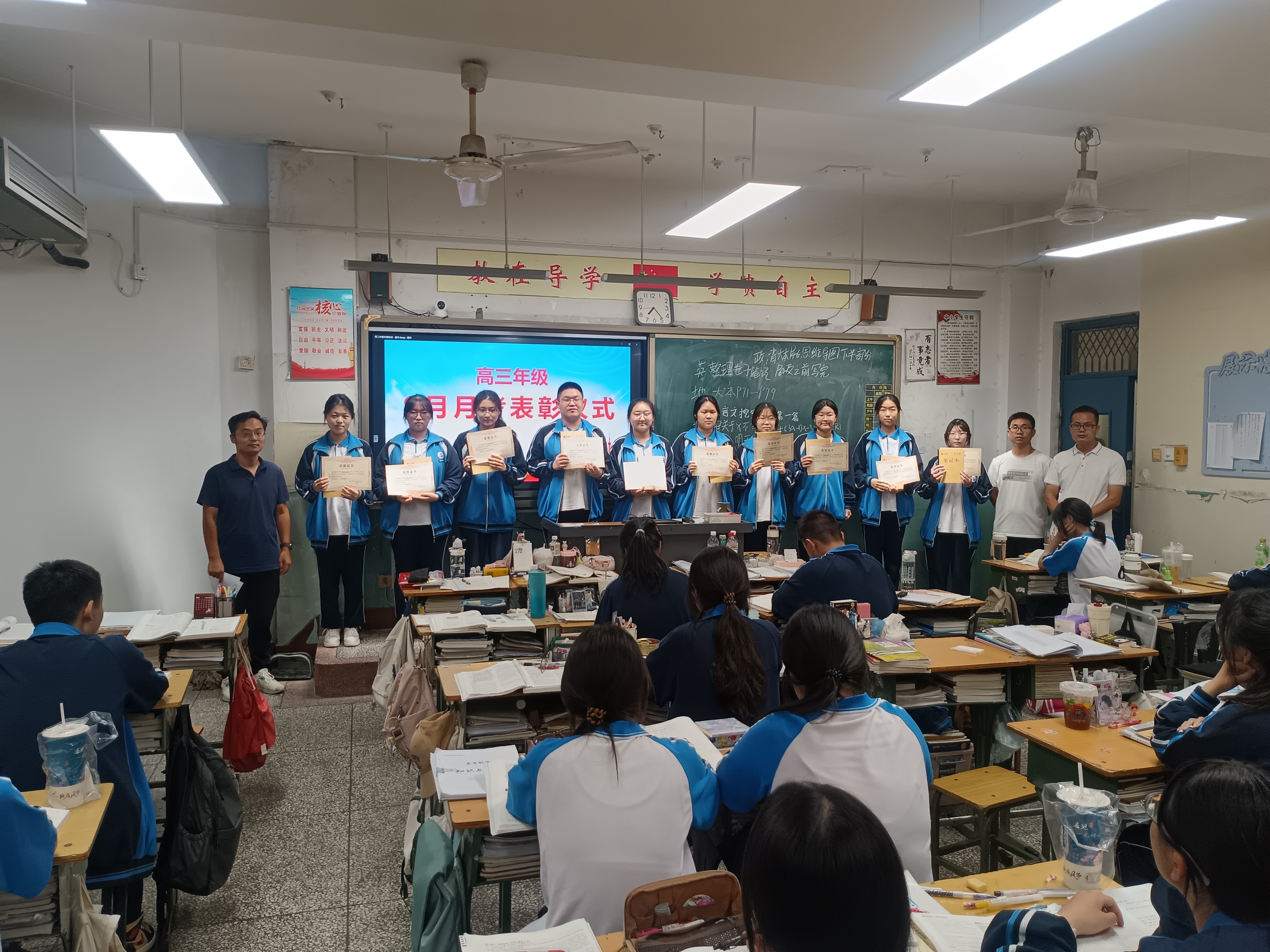 关山初度尘未洗,策马扬鞭再奋蹄。为进一步增强高三学子备战高考的信心,通过榜样引领激发学生的拼搏精神,营造更加浓厚的高考备考氛围,9月8日晚自习,高中部高三年级以各班为单位举行9月联考表彰大会,本次表彰大会由高三年级三位级主任以入班表彰的形式开展。