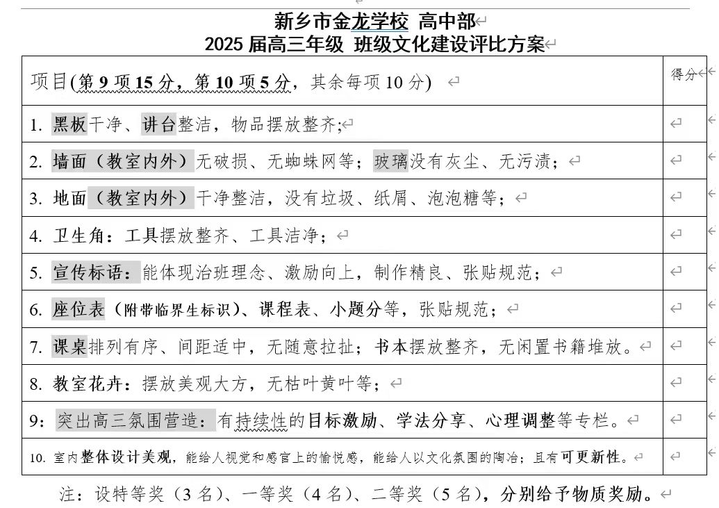 为保证本次评比活动的公开公平公正,高三年级拟定了详尽的评比方案,并邀请学部主任、各位级班主任担任评委。各评委成员对教室的文化墙、张贴栏、卫生角、整体布局及创意特色等方面进行了综合性的检查评比。各班班级文化建设充分发挥了班级建设在凝聚、引导、激励学生方面的积极功能,增强了学生的责任心和集体荣誉感,赢得到了老师们的一致好评。