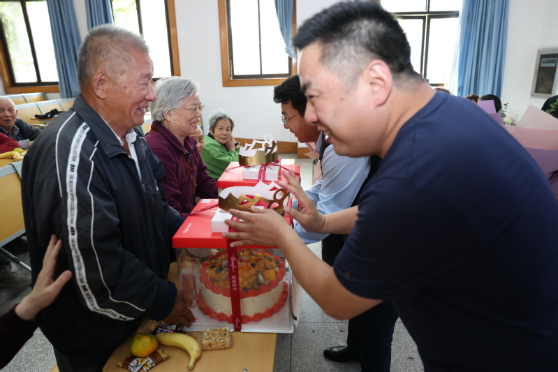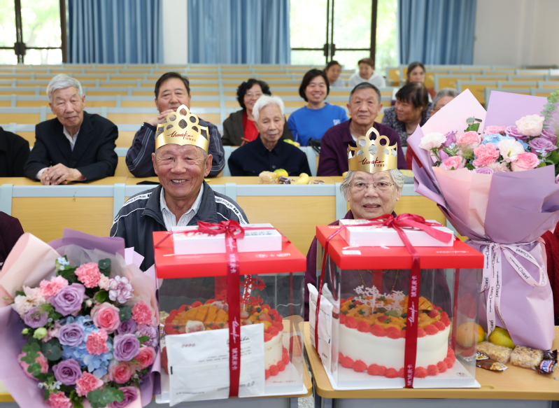 随后,与会领导和大家一起为今年年满八十岁的老寿星程乐华、张艳珠两位老师祝寿。校党委书记张银付和副校长杨呈杰为两位老寿星戴上生日帽,送上鲜花和生日蛋糕,祝愿他们寿比南山,幸福安康。