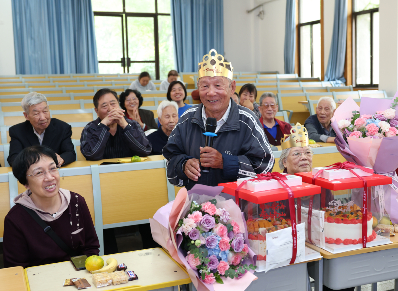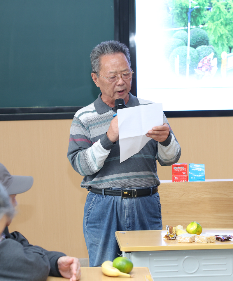 程乐华老师代表两位老寿星发表感言。他满心激动,表示这是他记忆中第一次过集体生日,既感动又幸福。作为附中的老校友和老教师,他回顾了自己的求学和执教生涯,对学生时代的老师们、并肩杏坛的同事们以及关心支持离退休工作的领导们表示了深深的感谢。最后,他用一段打油诗“七十古稀今不稀,八十才到中年期;百尺竿头再进步,与君携手奔期颐”道出了“最美夕阳红,添彩新时代”的美好希冀。