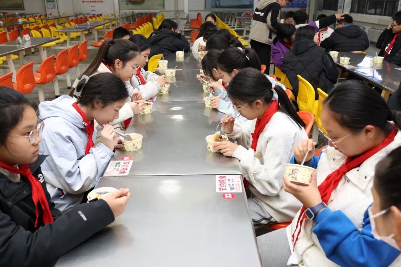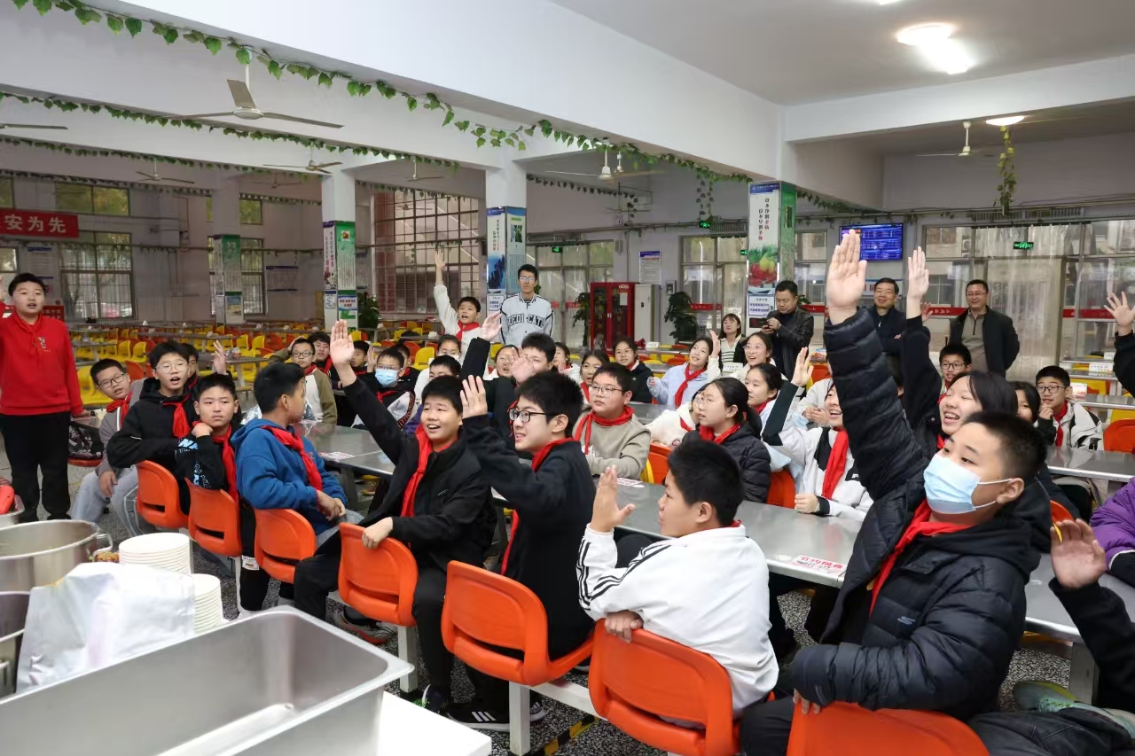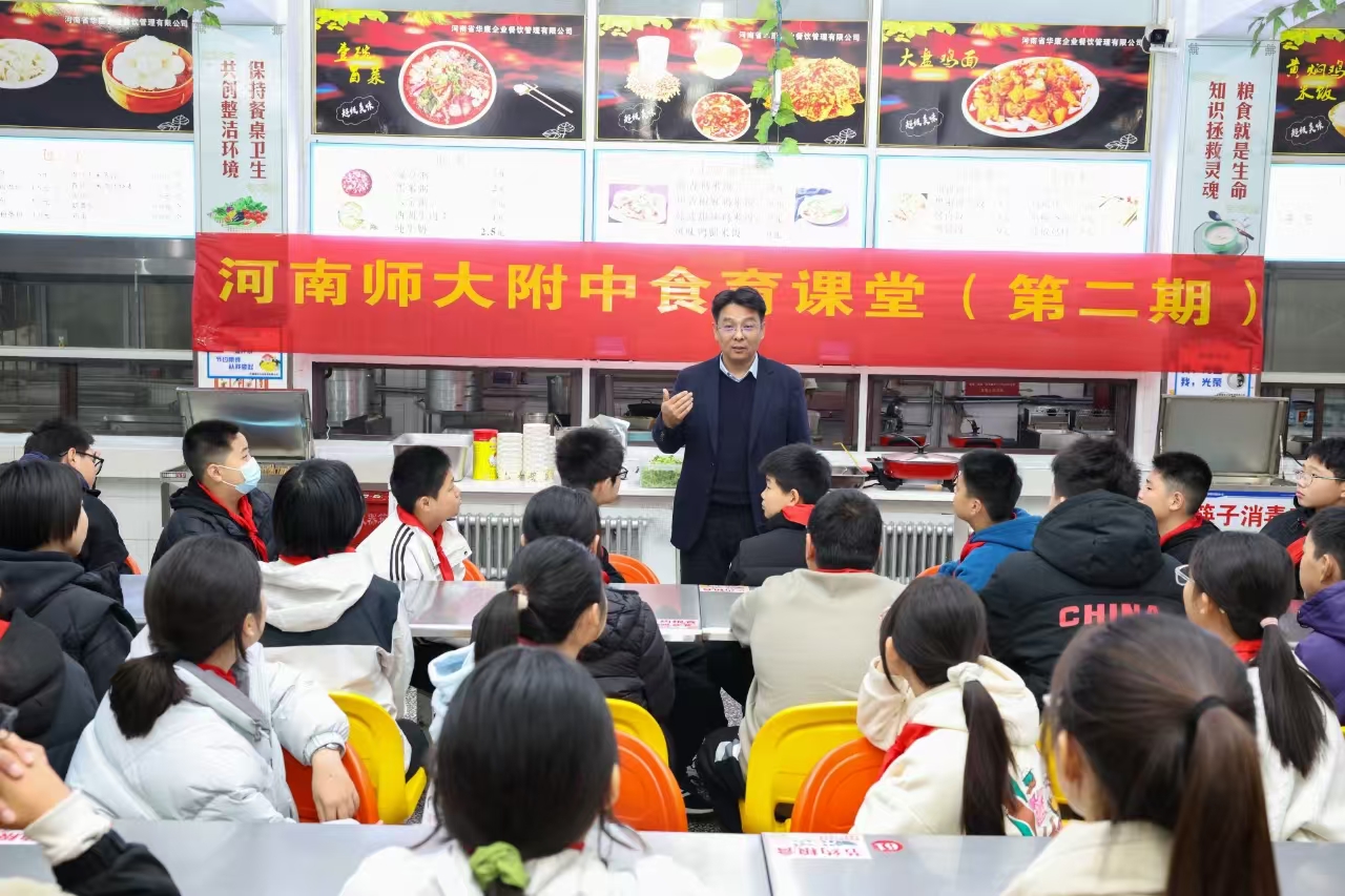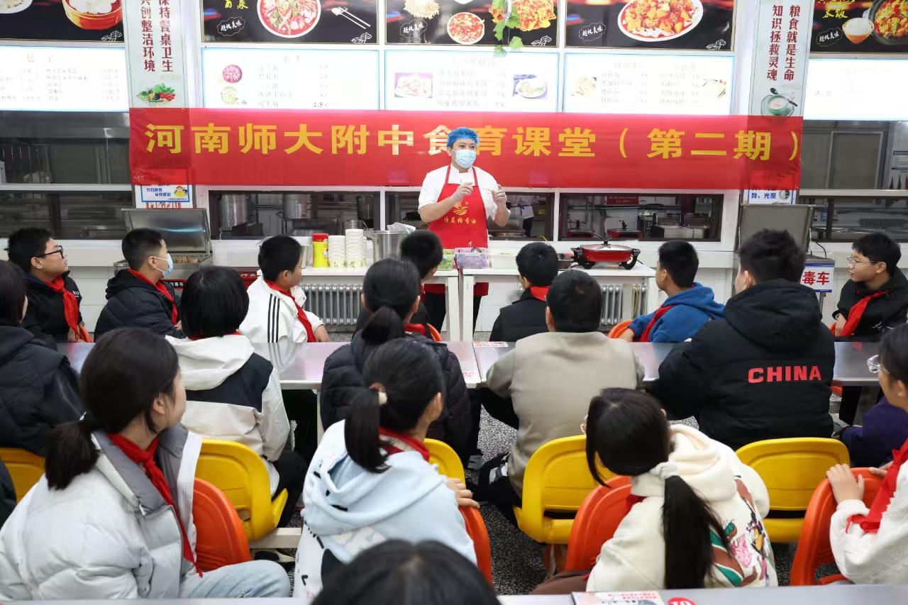 11月13日上午,我校第二期食育课堂在西校区餐厅举行。我校副校长杨呈杰,宿膳服务中心主任赵东亚、副主任付培林,以及新乡市平原中学初一年级的50名同学参加了此次活动。