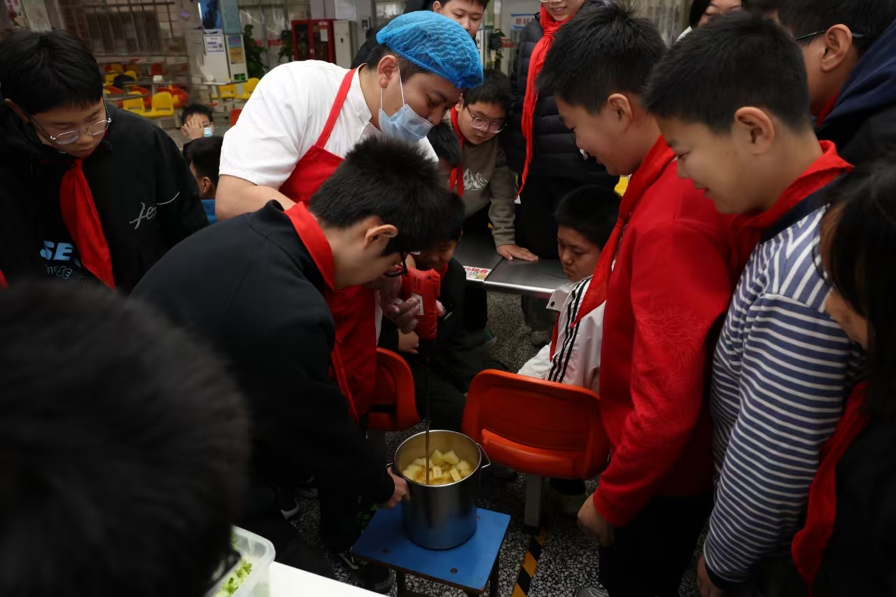 接下来由餐厅的营养师周玉川为同学们一一介绍食材,详细讲解了土豆泥的原料和做法,亲自示范并且邀请同学参与。同学们认真听讲,积极参与。一份份美味的酱香鸡米饭新鲜出炉,所有的同学一起分享了美味的成果。同学们纷纷表示:在这别样的课堂中收获很大,回到家之后,要亲自动手做一餐饭与家人分享。