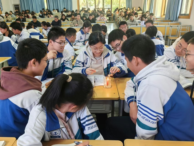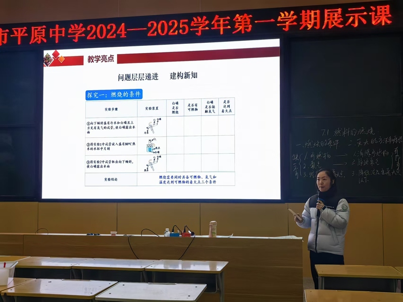 张冰老师以《燃料的燃烧》为主题进行授课。以“燃烧——灭火——逃生”为主线贯穿,引导学生借助控制变量法探究燃烧条件、灭火原理,探究层层深入,问题层层递进,驱动学生理解化学观念、形成科学思维、提升科学素养。课堂教学中融入“大国科技力量”、“消防安全”、“致敬英雄”等思政元素,体现了化学课程的育人功能。