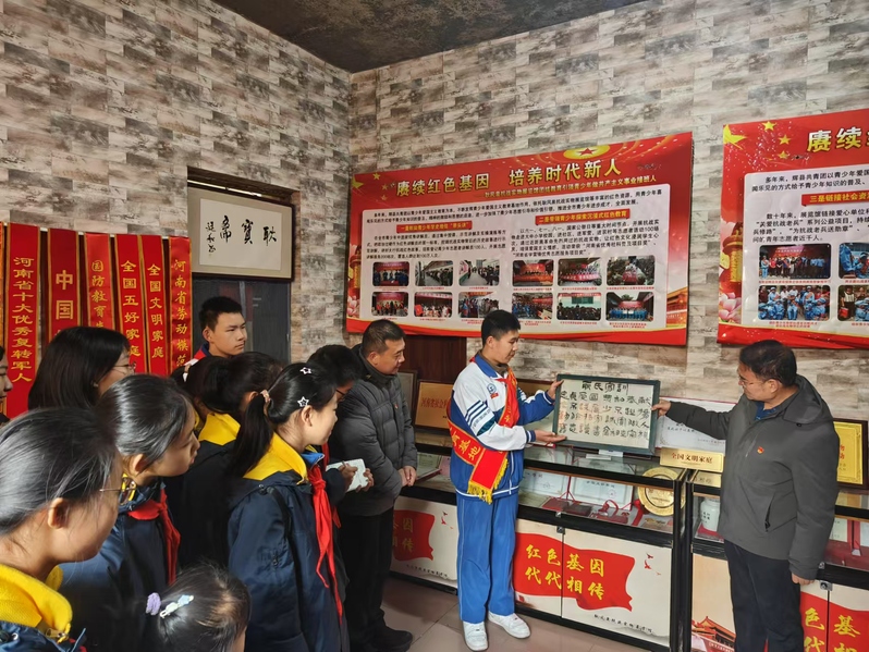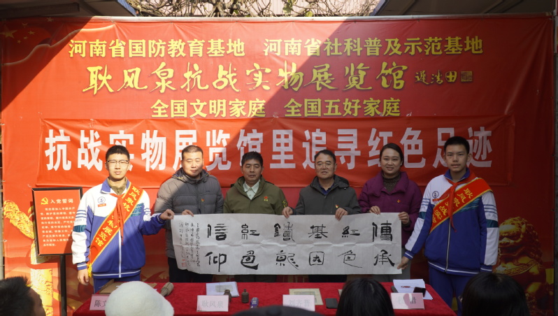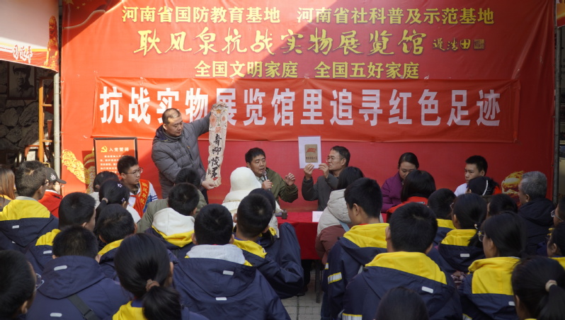 在我校初二年级红领巾志愿讲解员商怀檠、宋劲阳的讲解引导下,我校师生依次走进红色文化街和展览馆,学习抗战老兵耿风泉一家三代军人的先进事迹,零距离触摸抗战实物,诵读耿氏家训,感受全国文明家庭的良好家风、优良传统。