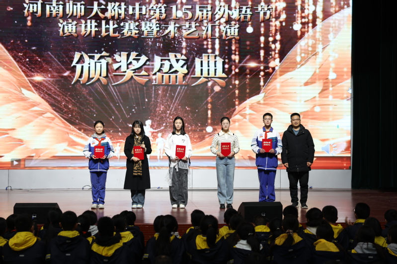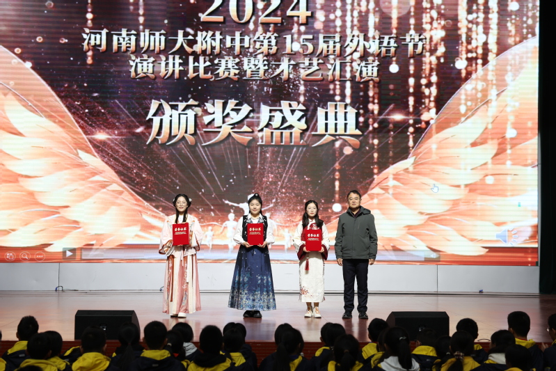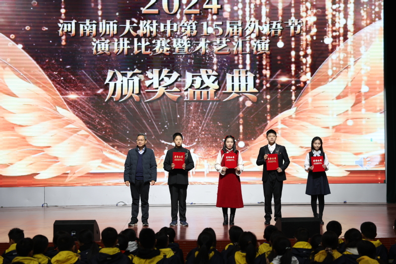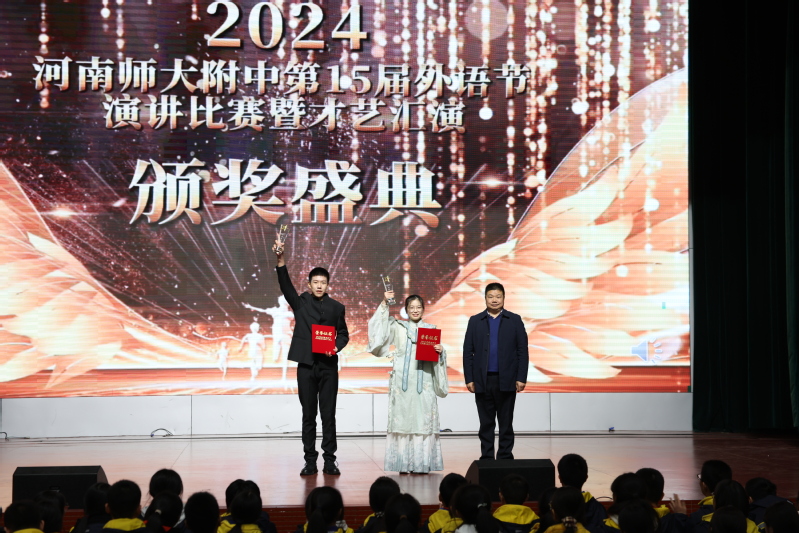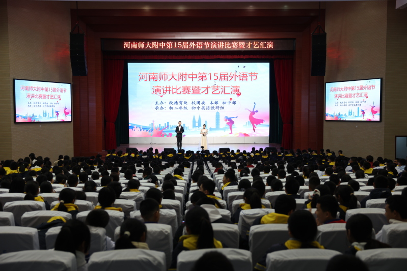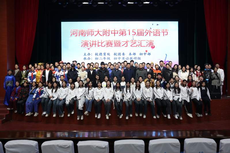 为激发学生对英语学习的兴趣,传播中华优秀传统文化,12月23日下午,我校第十五届外语节系列展演活动在西校区教工礼堂成功举办。河南师大附中校长李杰明,党委副书记、纪委书记、工会主席刘齐晋,新乡市平原中学党组织书记刘志强出席活动,相关部门负责人以及师生代表600余人参加活动。汇演活动由初二年级张子坤和齐贝尔两位同学主持。