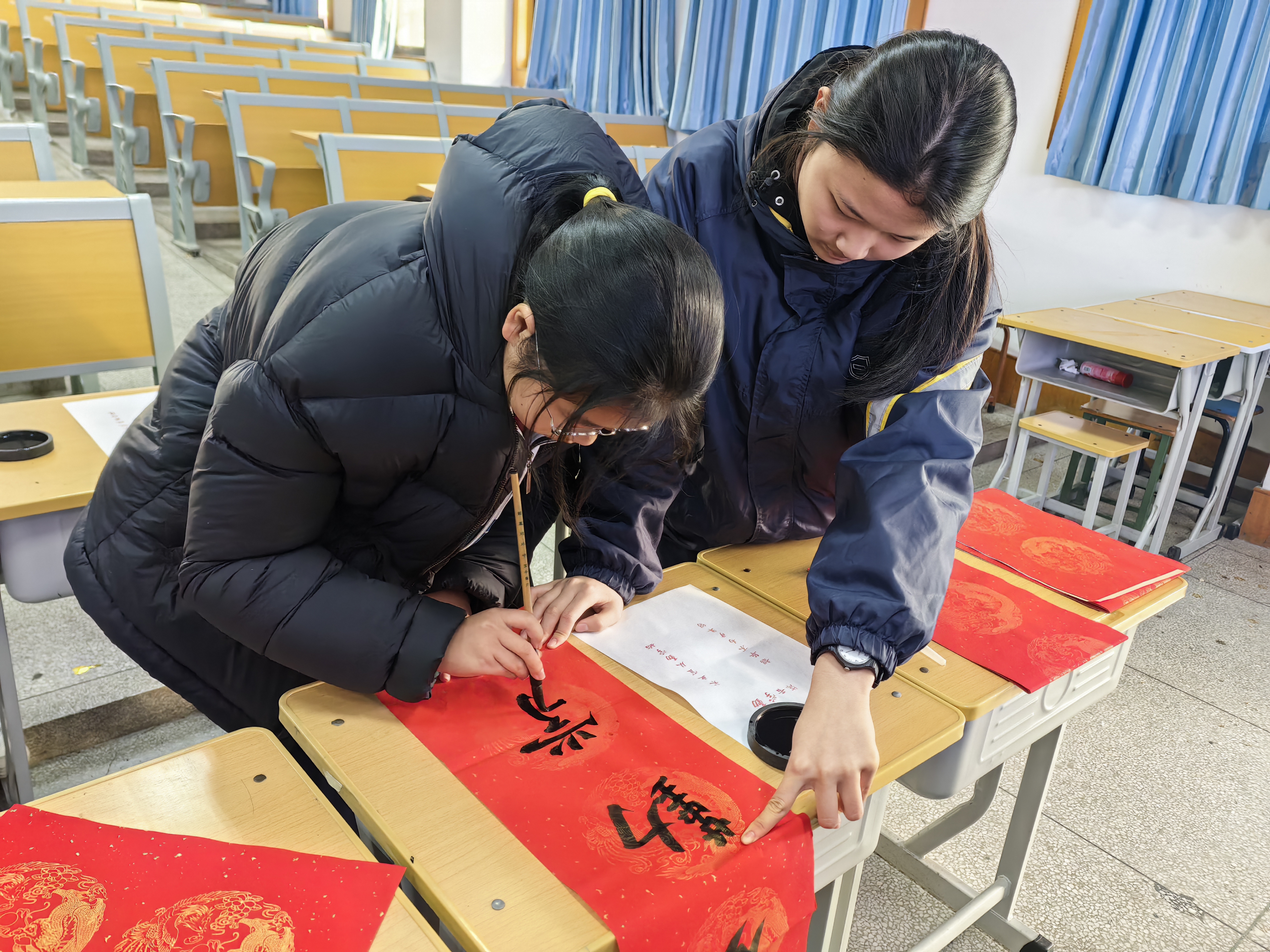 执笔辞旧,翰墨迎新。各班学生代表全神贯注、认真书写,他们手执毛笔,任笔锋如灵蛇舞动、如蛟龙出海,一笔一画遒劲有力,一撇一捺吉祥如意。一幅幅春联在同学们的笔下应运而生,或苍劲有力,或娟秀端庄,展现了同学们深厚的书法功底,饱含着挥别腾龙、喜迎灵蛇的美好祝愿。