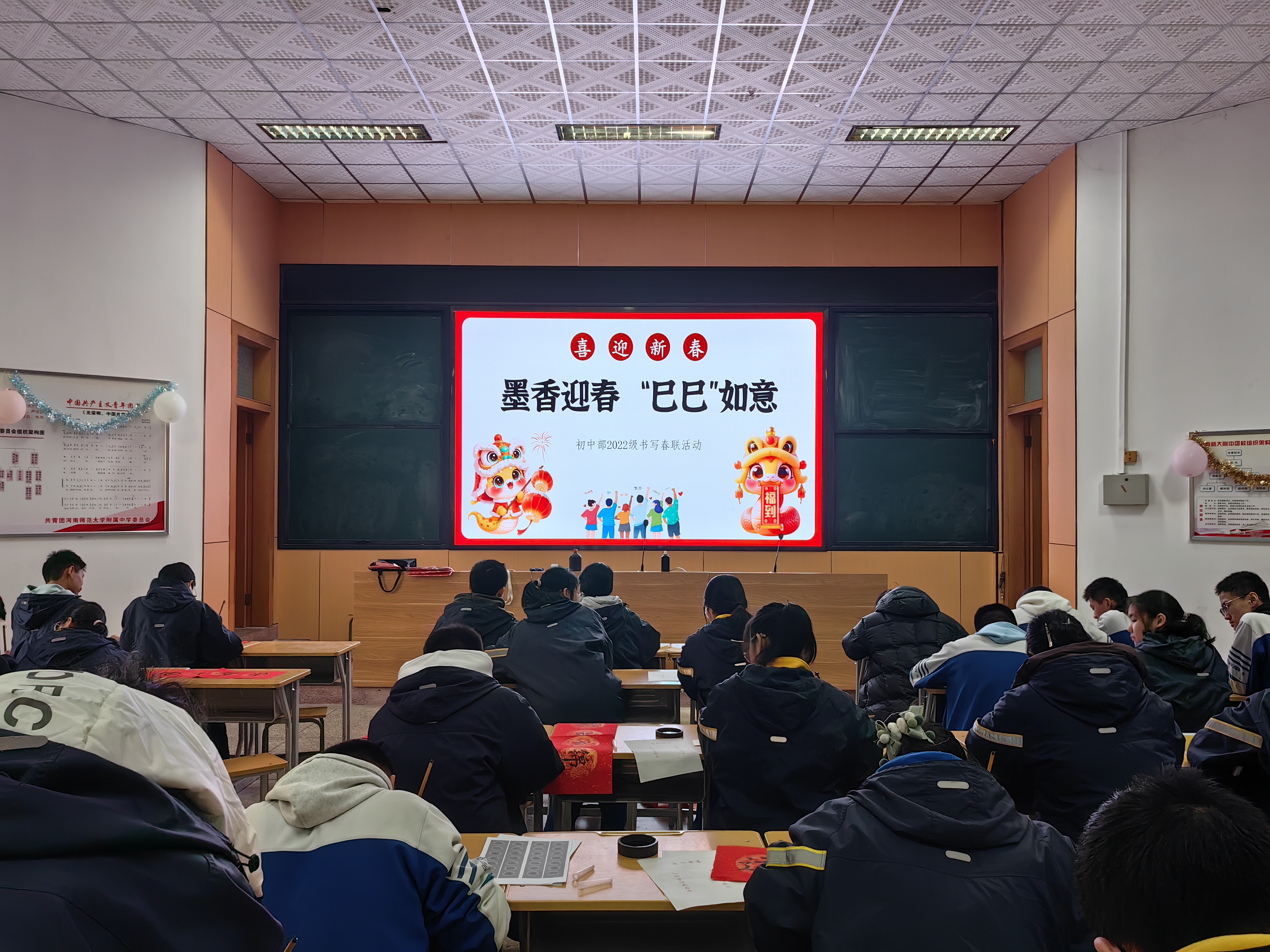 为传承和弘扬中华民族优秀传统文化,丰富师生精神文化生活,营造喜庆祥和的节日气氛,1月13日下午,初中部2022级举行“墨香迎春 ‘巳巳’如意”春联书写活动。