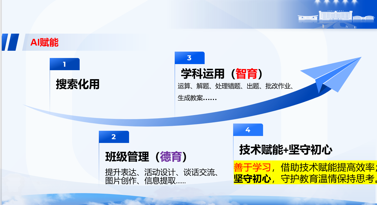 吐故纳新,方能笃行致远;追求精进,永葆进取之心。据悉,2024年教育部发文提出“人工智能赋能教育行动”,并提出2030年前普及AI教育,强化AI工具在课堂中应用。我校高中教育教学部紧扣时代脉搏,积极开展AI赋能教育教学实践经验分享交流会。本次活动提升了教师们对AI辅助教学价值的认识,为教学创新开辟了新的思路。展望未来,我们将继续推动AI技术在教学中的应用,探索其与教育教学的深度融合,为我校教育教学带来创新与突破,为教学质量发展减负增效。