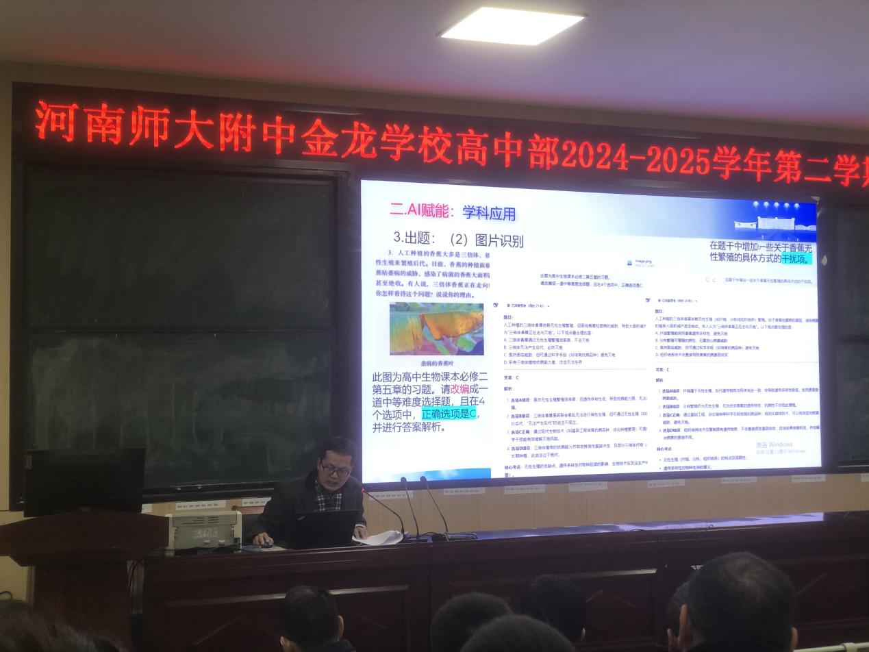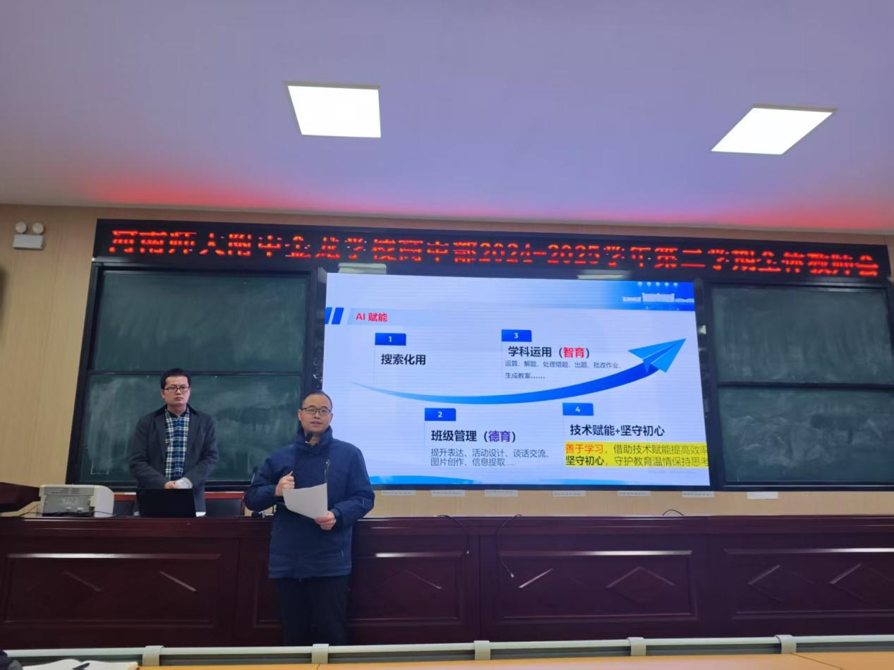 科技赋能教与学,育见未来知且行。随着人工智能(AI)技术的飞速发展,AI 技术以前所未有的速度渗透到教育领域,激起层层巨浪,给每一位教育人带来前所未有的机遇和挑战。为了让老师们更快的适应科技变革,让AI技术赋能教育教学,我校高中教育教学部于2月11日下午精心组织了“AI赋能教育创新,智慧引领教师成长”的专题培训活动,本次活动由高三年级主任刘长杰主讲,高中部全体教师到场参会。