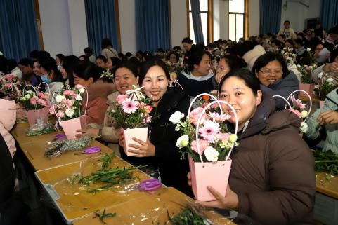 学习结束后,一场别开生面的花艺课堂将活动推向高潮。学校特邀花艺师临场指导,以“指尖生春意 花语寄初心”为主题,带领女教职工体验插花艺术。老师们认真聆听讲解,细心动手实践,在康乃馨、洋桔梗等各色花材的芬芳中,她们褪去课堂上的严肃,化身巧手“花匠”,沉浸于创作之中,展现出严谨治学之外的艺术修养与生活情趣。阶梯教室花香洋溢,老师们脸上幸福氤氲。看着自己的作品,程桂红老师感慨道:“育人就像这插花一样,我们要因材施教,用心雕琢,尊重每一枝叶的独特姿态,给每一朵花绽放的时空。”