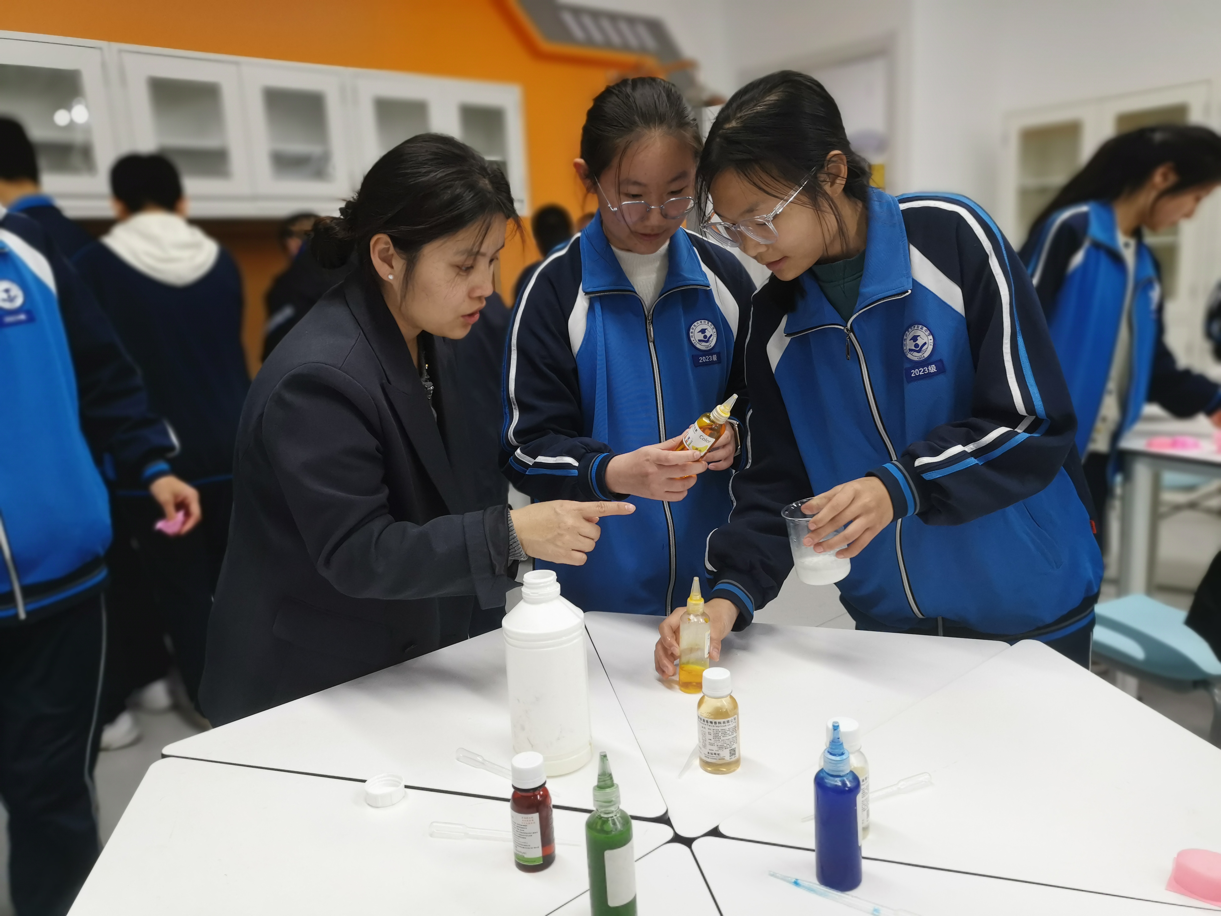为了制得色香型俱全的肥皂,老师们向同学们详细地介绍了皂基的制作、起泡剂和柔顺剂的作用以及皂基与其的比例,同学们此刻感受到课本知识“活”了起来。
