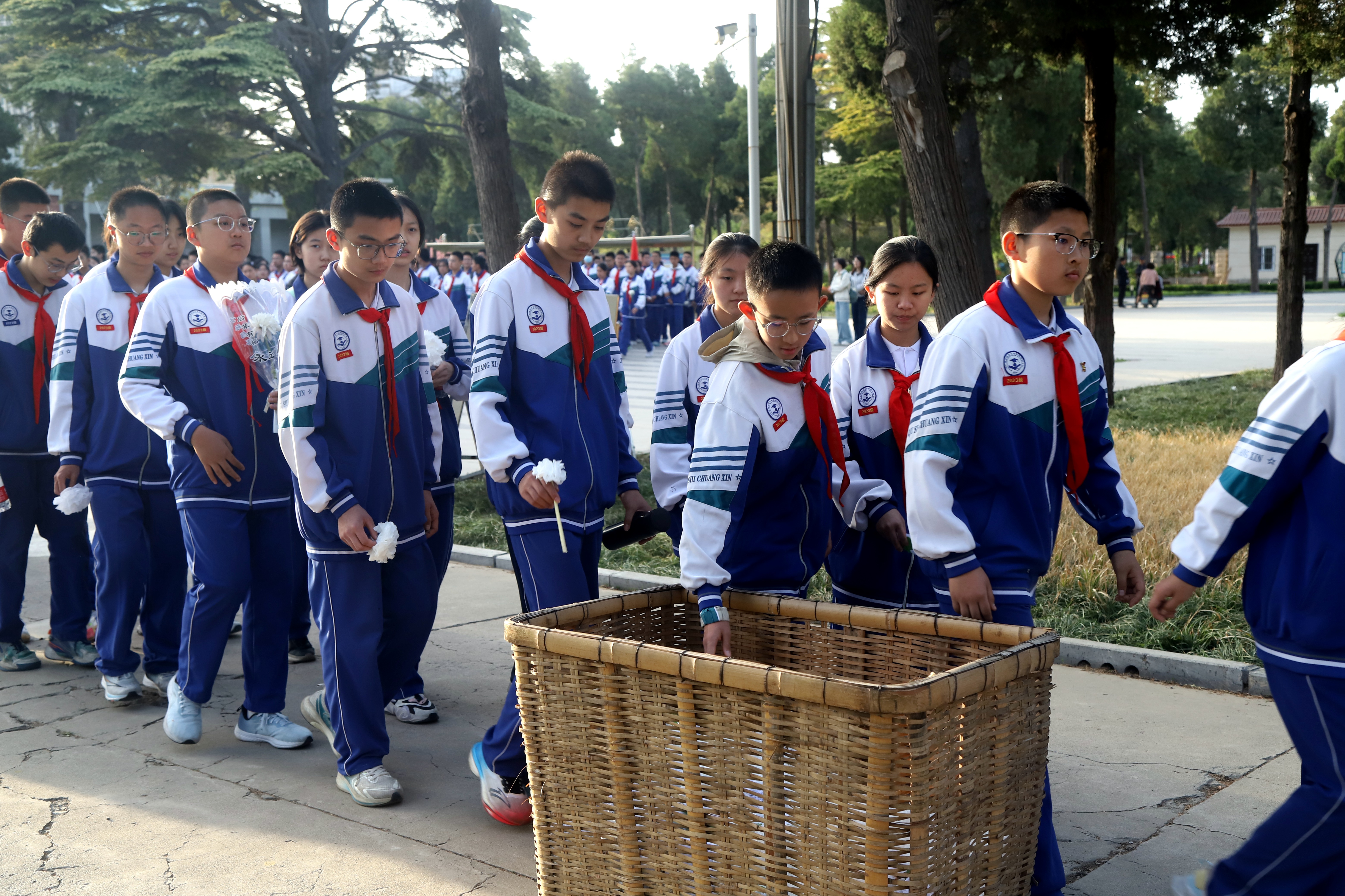 下午2时30分,初二年级学生穿着干净整洁的校服,佩戴红领巾和队徽,手执精心制作的小白花,从学校出发,步行前往烈士陵园。