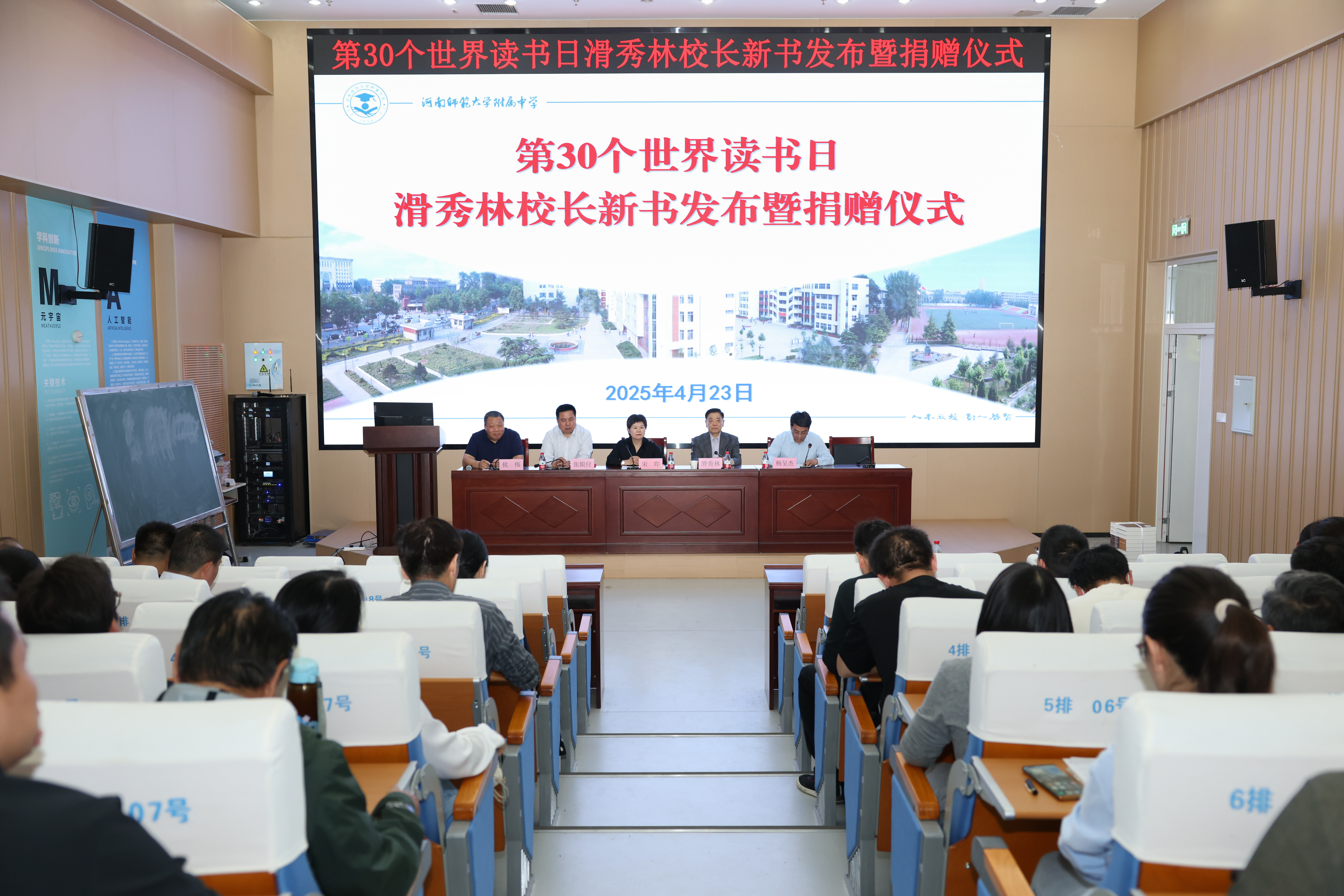 打造书香校园,推进全民阅读。时值第30个世界读书日,我校在综合实验楼阶梯教室举行滑秀林老校长个人最新教育专著《坚守正道 系统育人》发布暨捐赠仪式。新乡市政协副主席、河南师范大学副校长宋晔,我校原校长、原党委书记、名誉校长滑秀林,校领导张银付、杨呈杰、侯伟出席仪式,各部门负责人、年级主任、各党支部书记,河南师范大学基础教育集团成员校的领导、教师代表共同见证这一特殊日子的特别时刻。仪式由副校长杨呈杰主持。