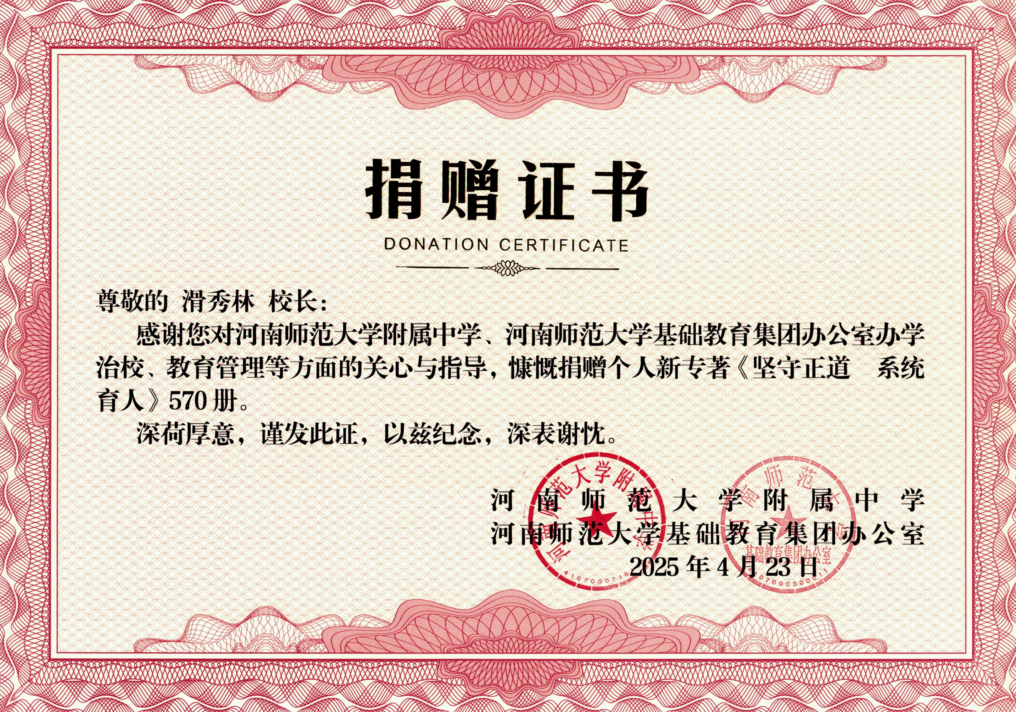 接下来,滑秀林向我校捐赠其个人教育专著《坚守正道系统育人》。