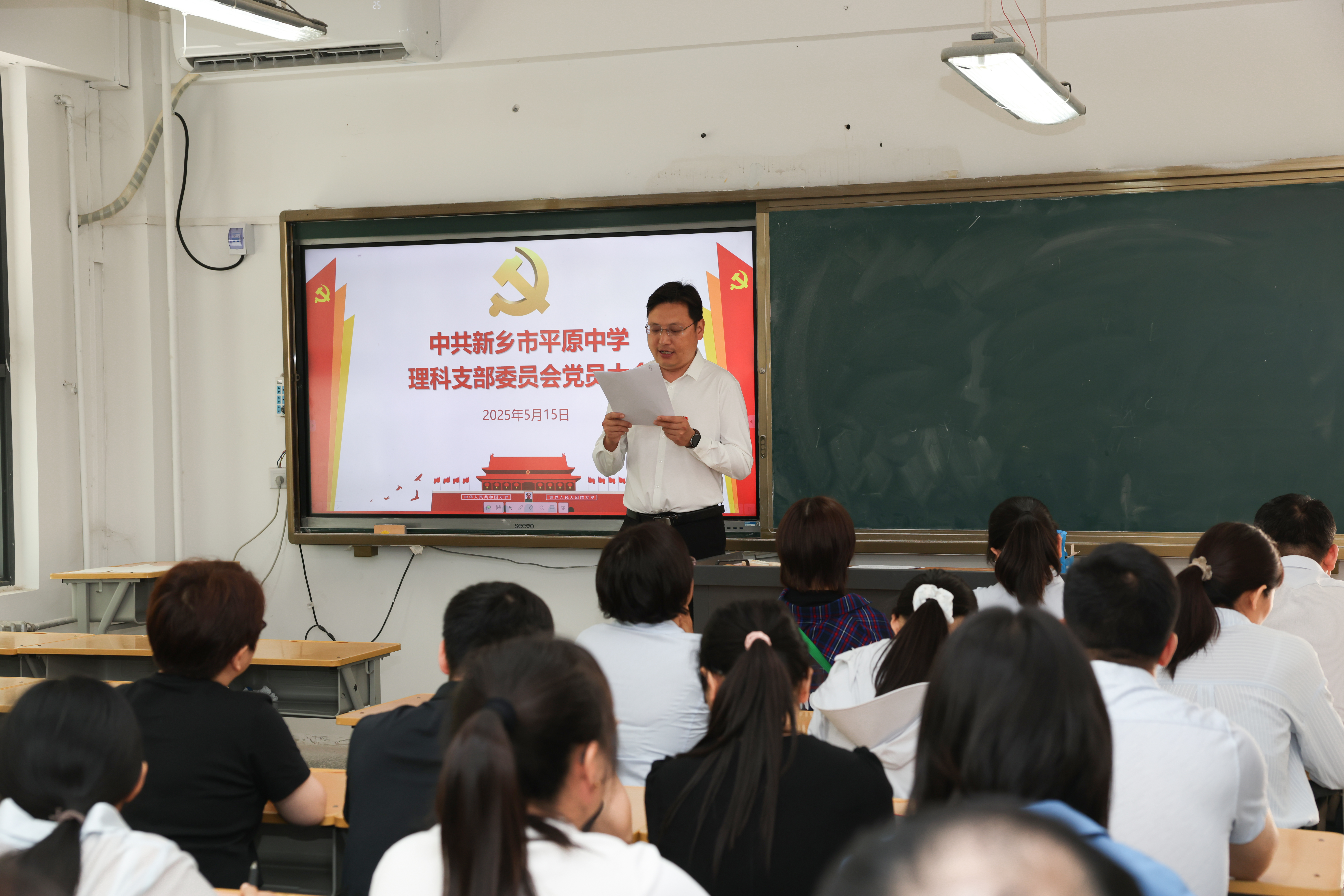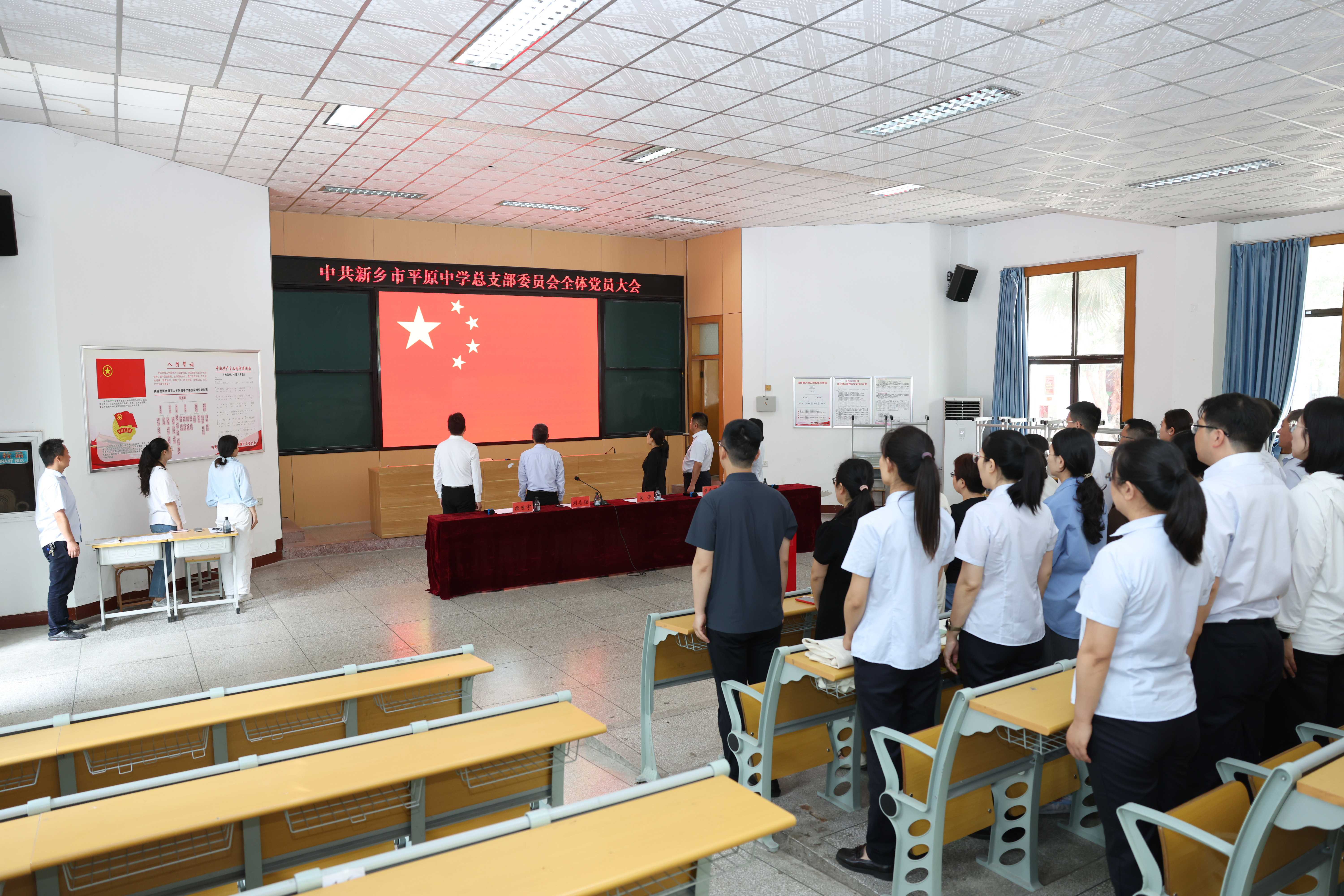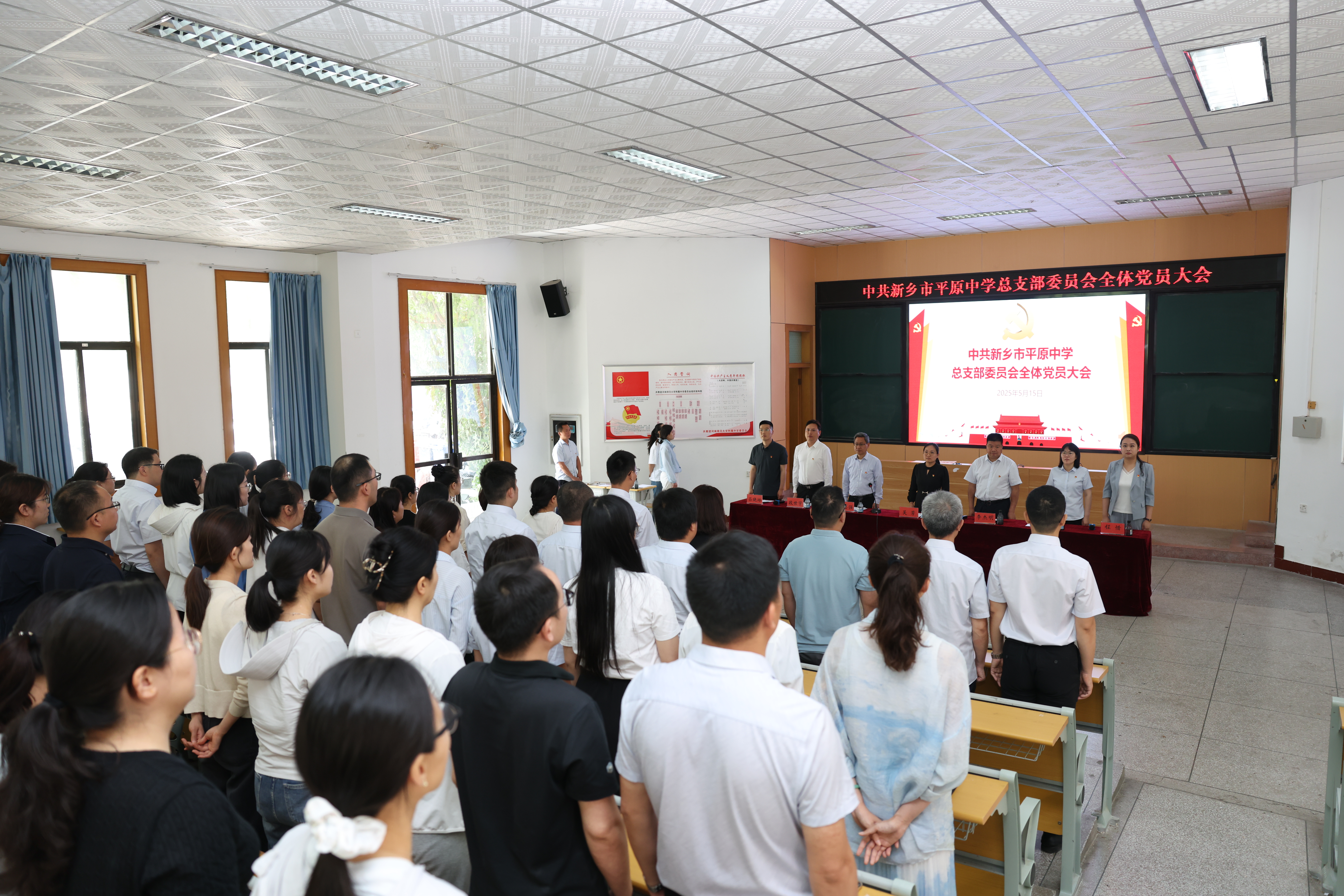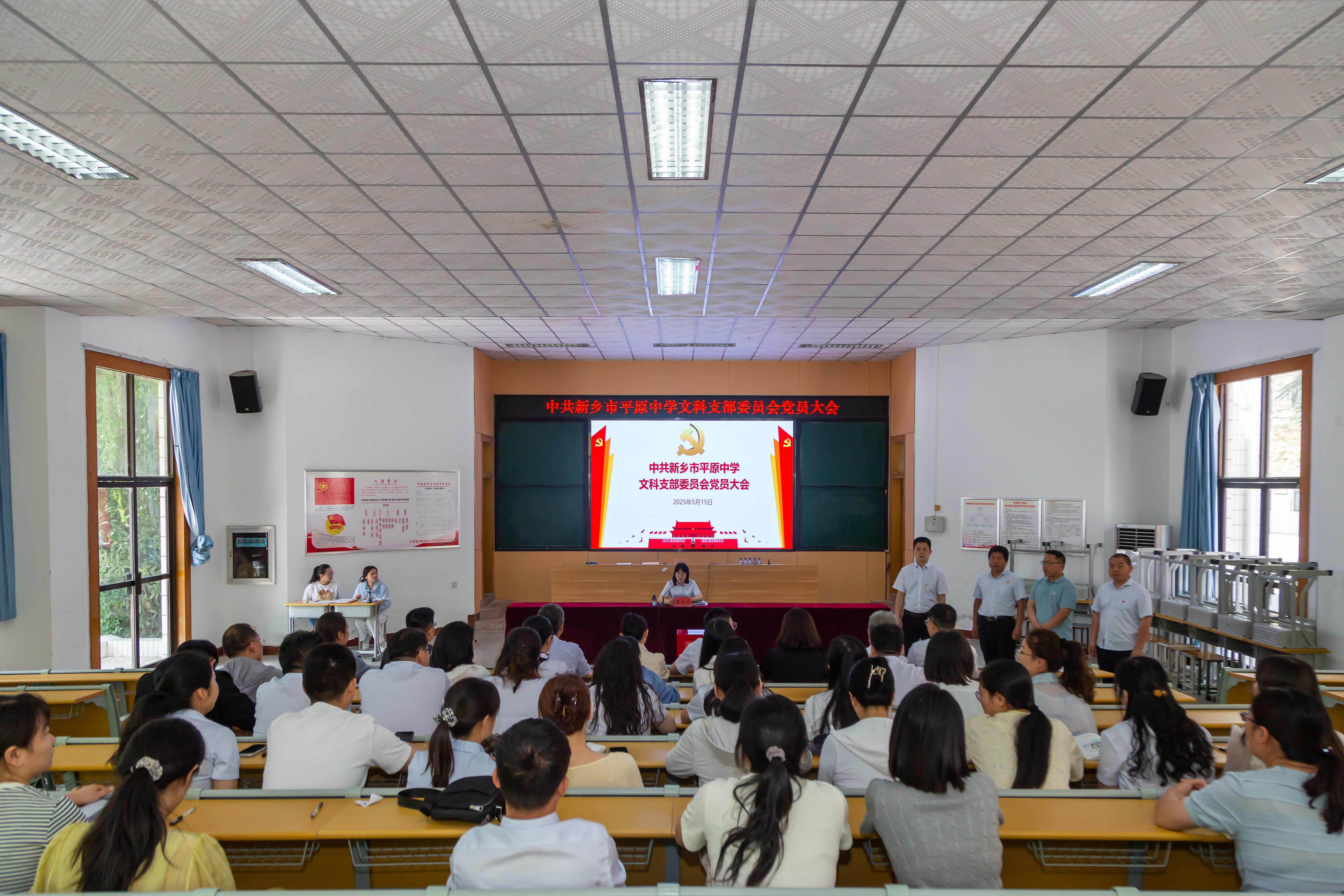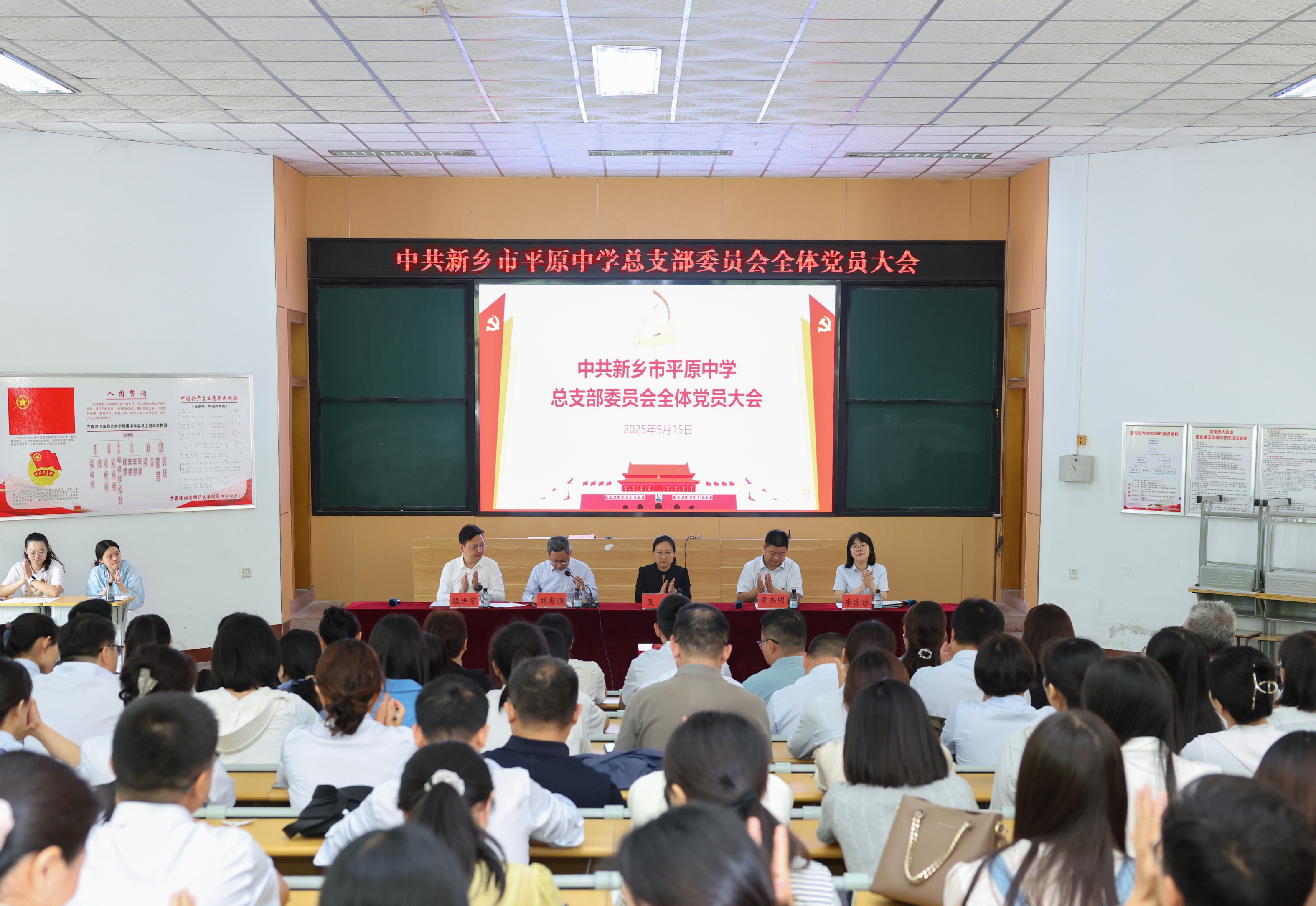5月15日上午,新乡市平原中学党总支成立大会在我校西校区阶梯教室成功召开。中共新乡市教育局机关和直属单位委员会专职副书记吴芳,新乡市平原中学校领导李杰明、刘志强、段世宇、李沙沙出席大会。大会由新乡市平原中学党总支书记刘志强主持。