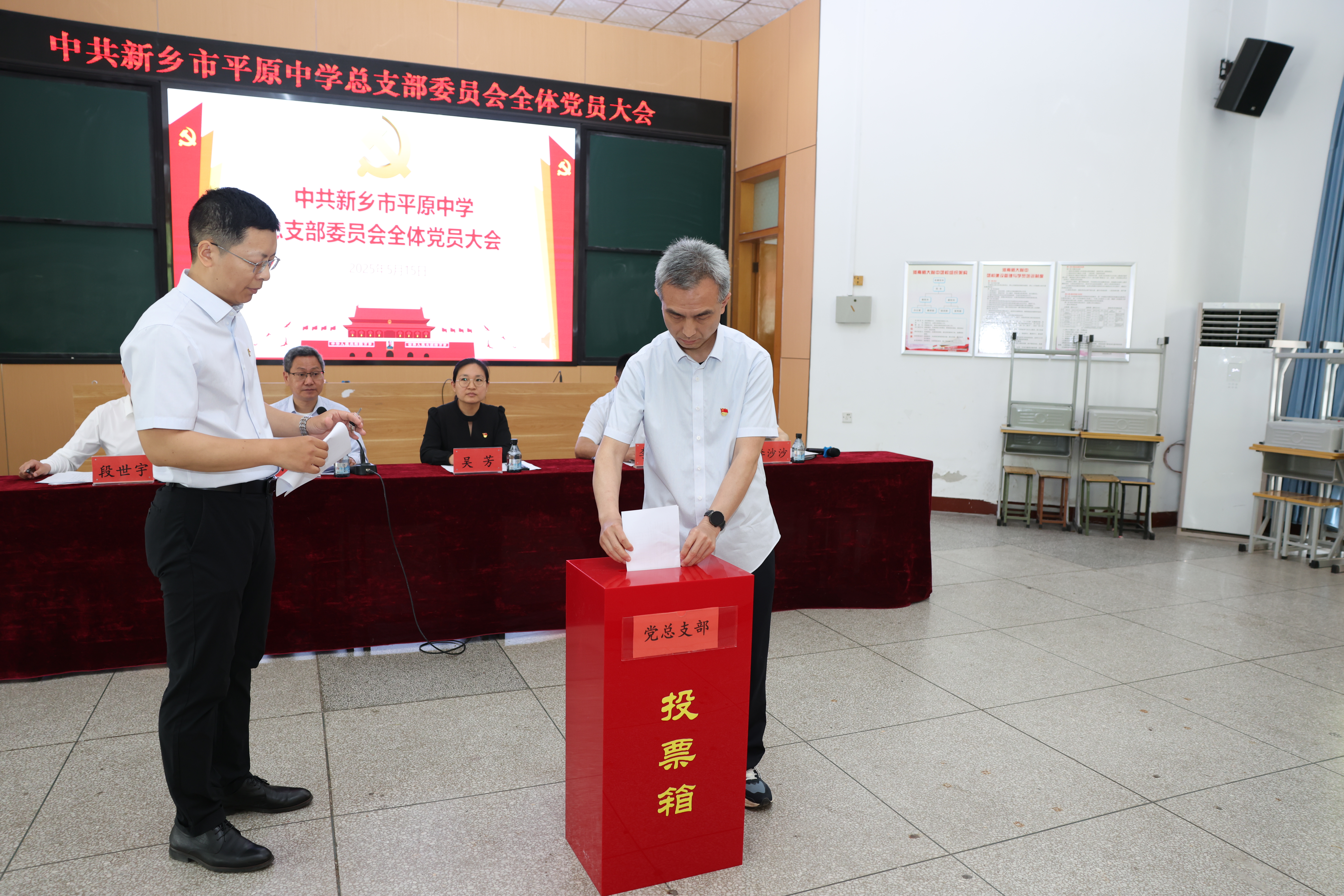 新乡市平原中学副校长段世宇宣读《中共新乡市平原中学总支部委员会选举办法》,与会党员以举手表决的方式一致通过。