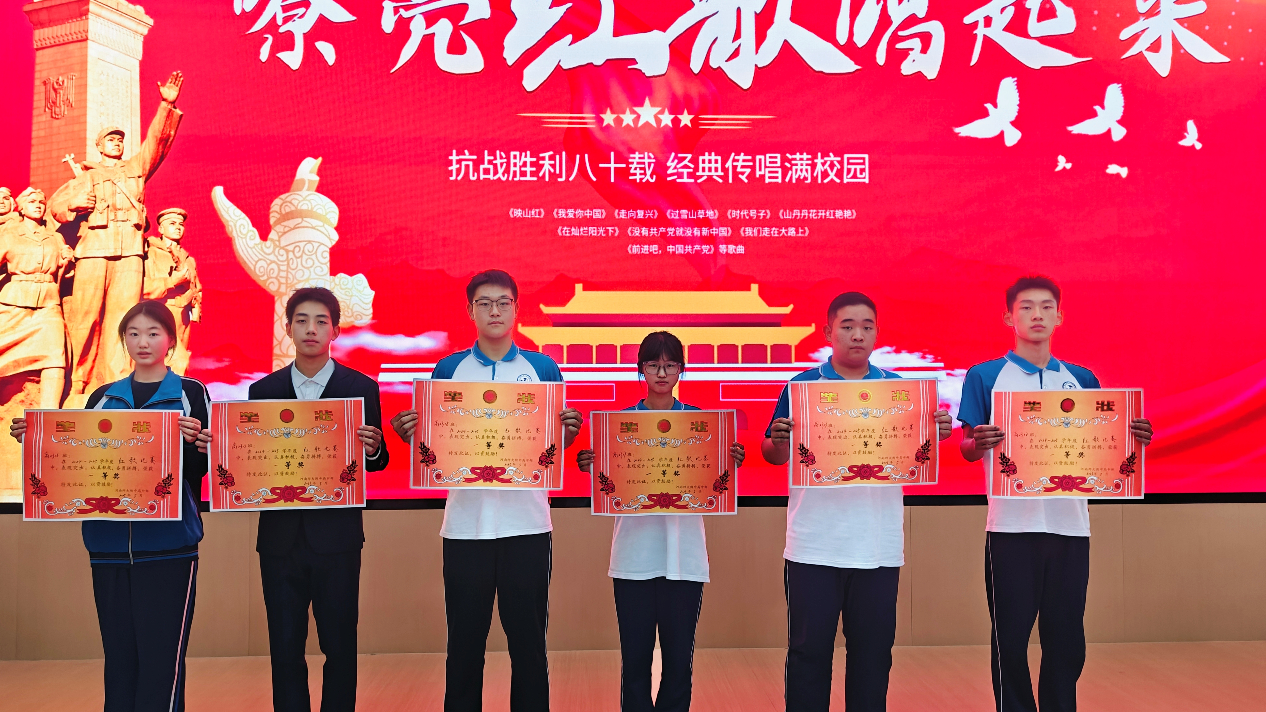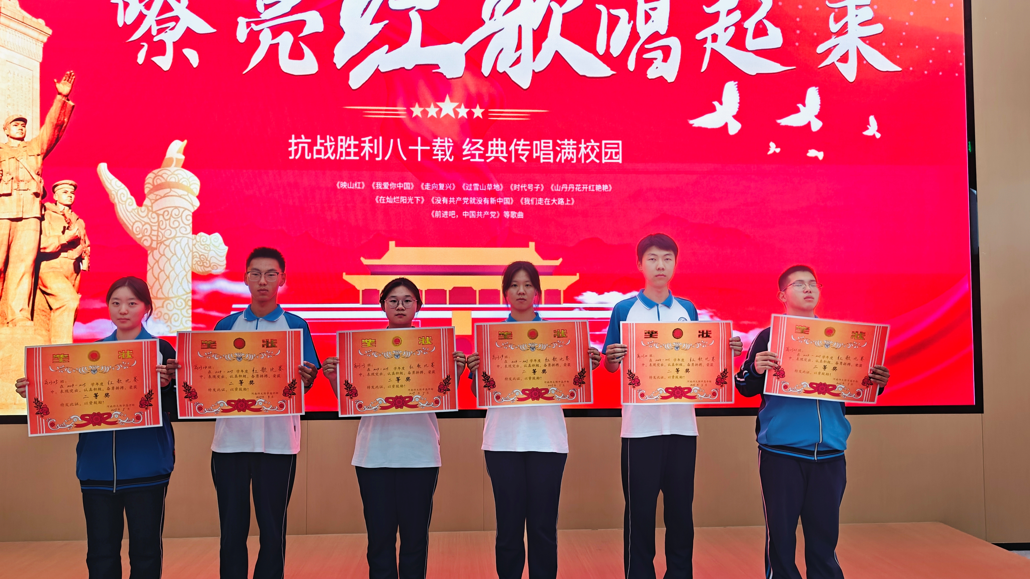 经过激烈角逐,比赛评选出多个奖项。同学们不仅展现了扎实的演唱功底,更用歌声传递出新时代青年‘请党放心,强国有我’的坚定信念。评委老师为获奖班级颁发证书时勉励全体学生:“红歌比赛是生动的思政课堂,希望同学们从歌声中汲取力量,让红色基因成为青春最鲜亮的底色。”