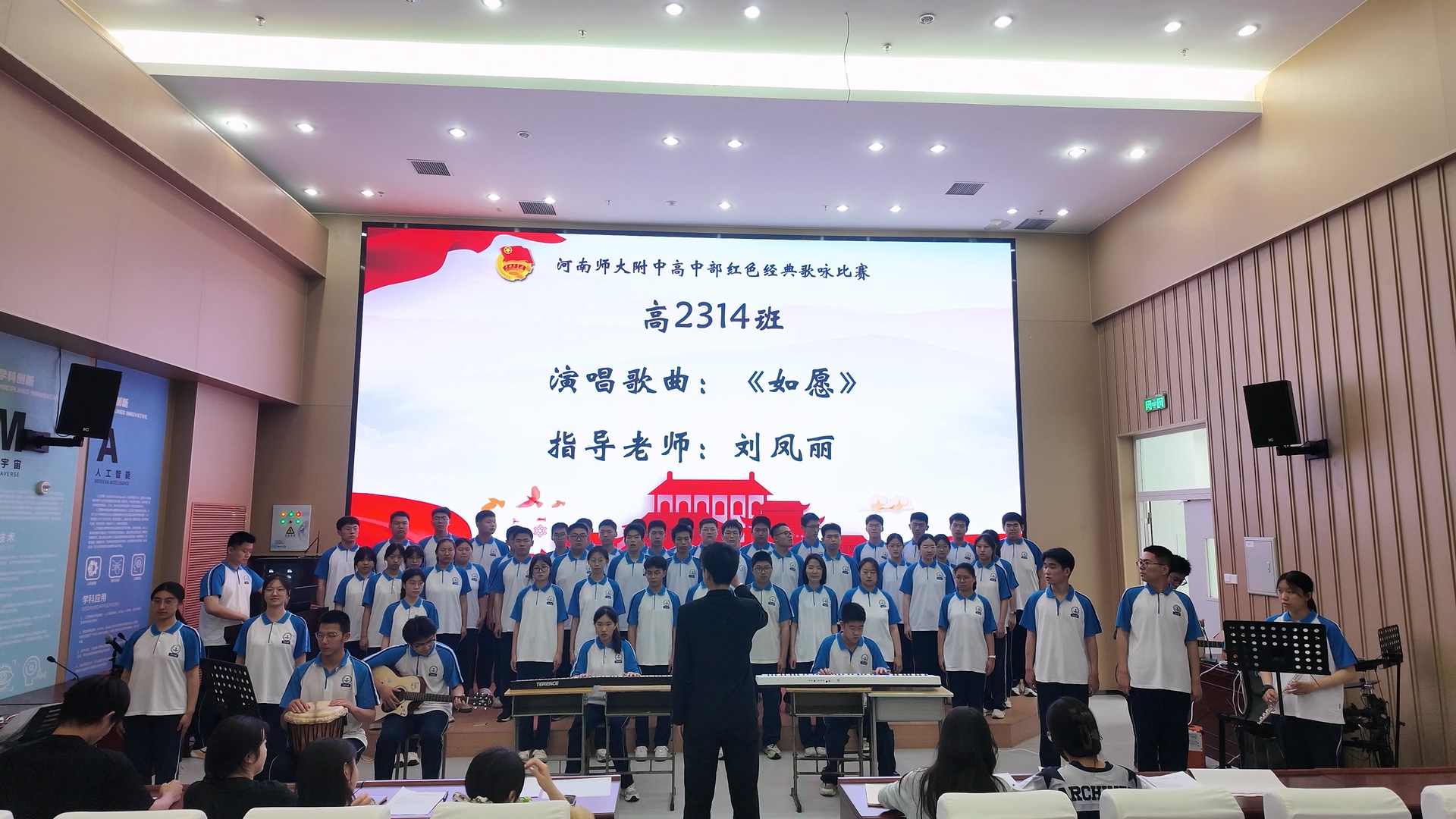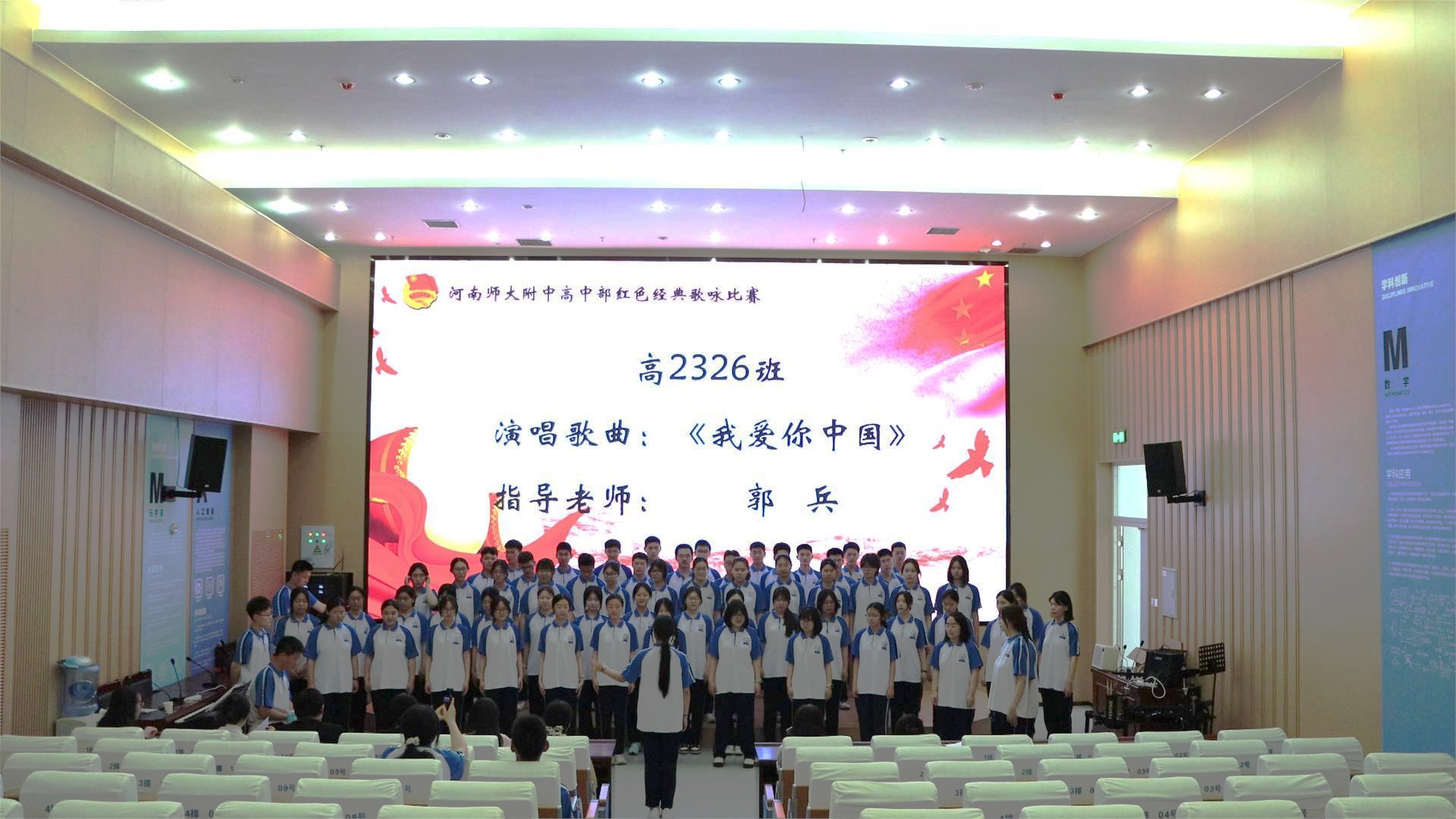 为深化青少年爱国主义教育,我校高中部高二年级于5月9日下午在新实验楼阶梯教室举办了“抗战胜利八十载·经典传唱满校园”主题歌咏比赛。活动旨在通过传唱经典革命歌曲,引导青年学子铭记光辉历史、赓续红色血脉,同时展现新时代高中生昂扬向上的精神风貌。比赛现场气氛热烈,掌声雷动。