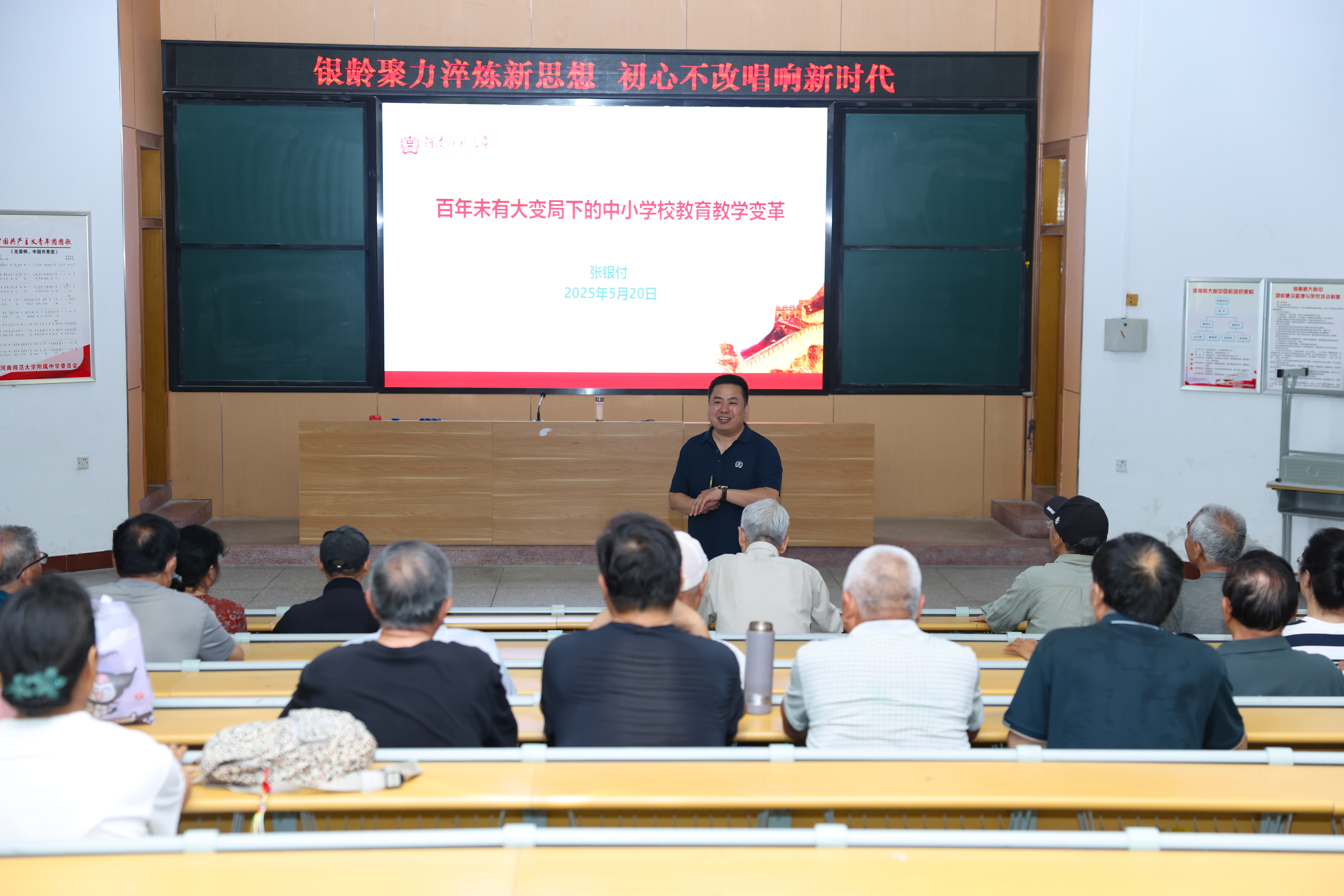 在“520”这个饱含深情的日子里,西校区逸夫楼阶梯教室红歌嘹亮。5月20日,校党委书记张银付以《百年未有大变局下的中小学校教育教学变革》为题,为我校退休教职工作形势与政策报告。通过“思想引领+红歌传唱”的独特形式,为老同志们带来一场精神盛宴。