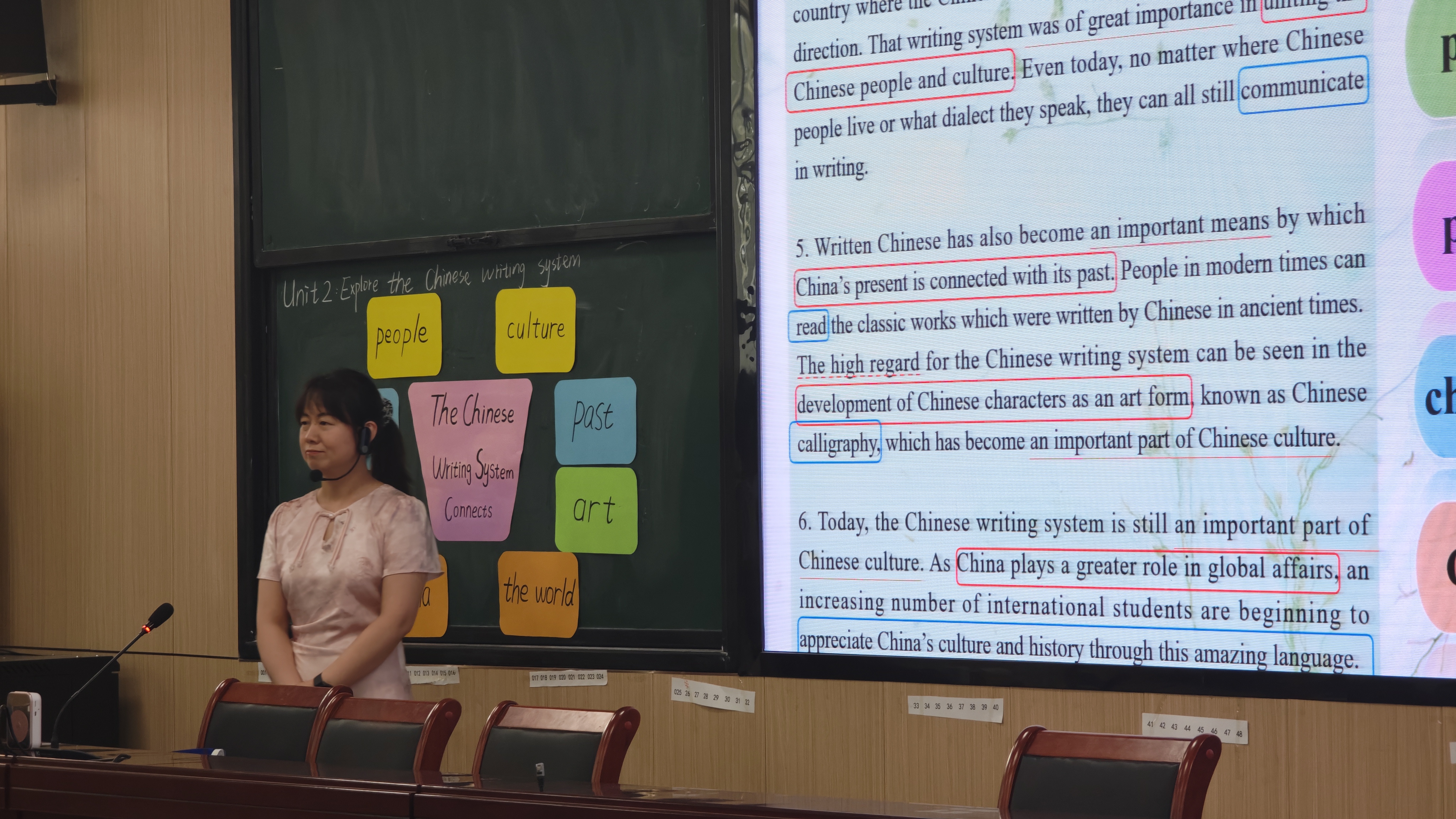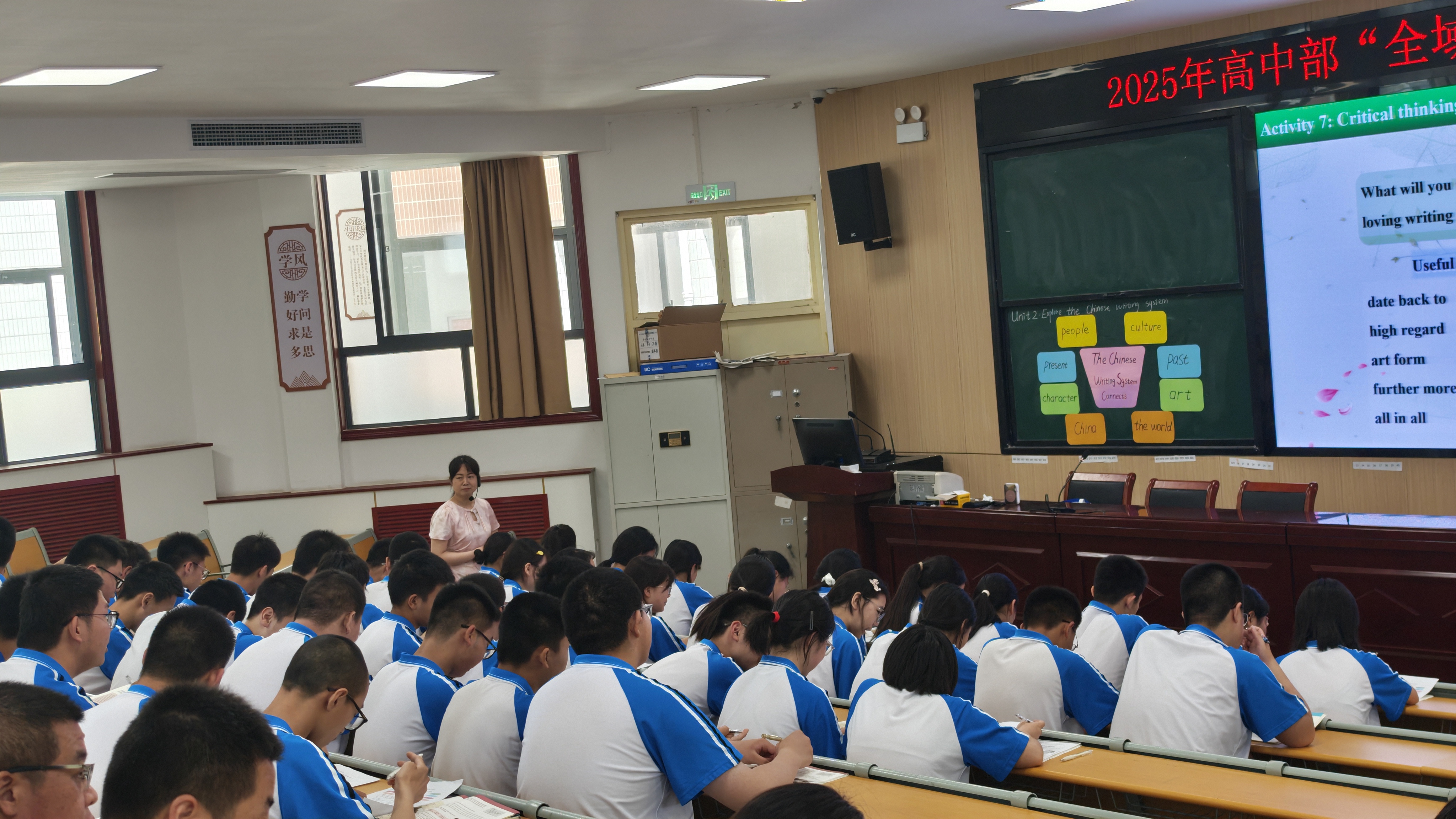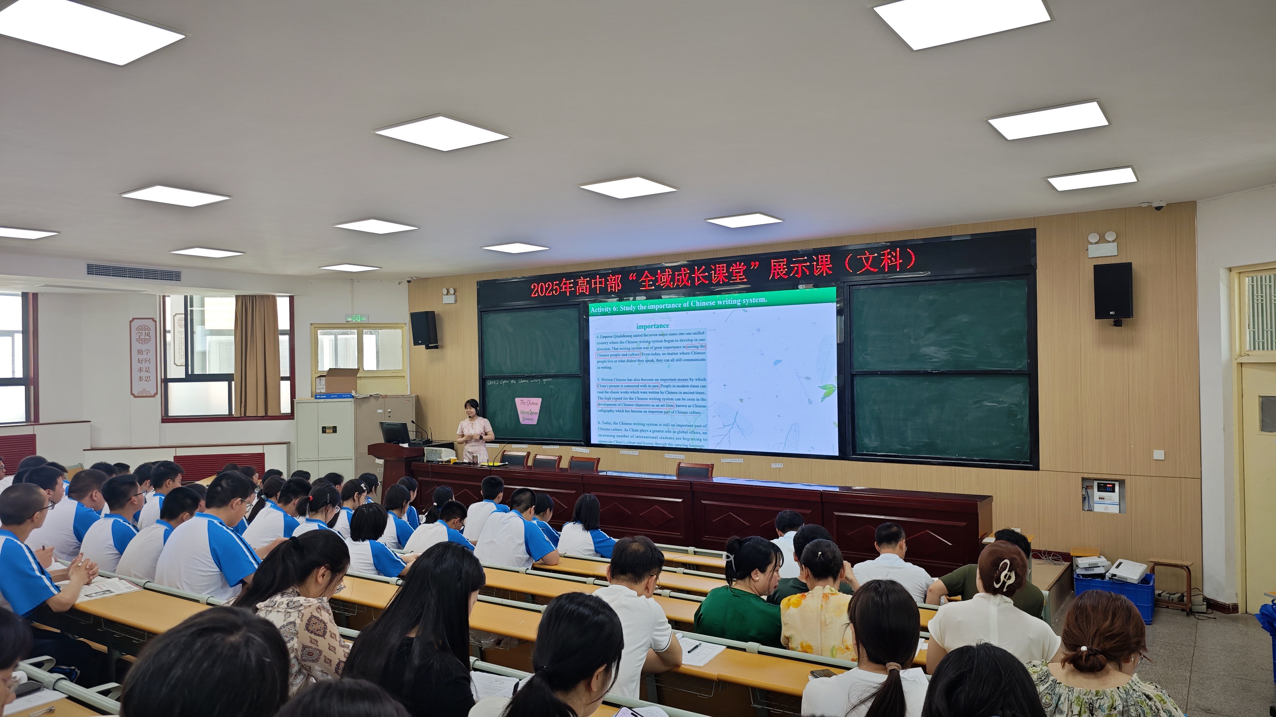 为提升教学质量,打造高效课堂,构建面向未来的教育新生态,5月20日上午,金龙高中部文科教师齐聚一号楼阶梯教室,共同观摩了高一年级张慧萍老师的英语展示课——“The Chinese Writing System: Connecting the Past and the Present”。河南师大附中副校长陈景任,金龙高中部主任刘毅,副主任李忠堂、刘付生出席。