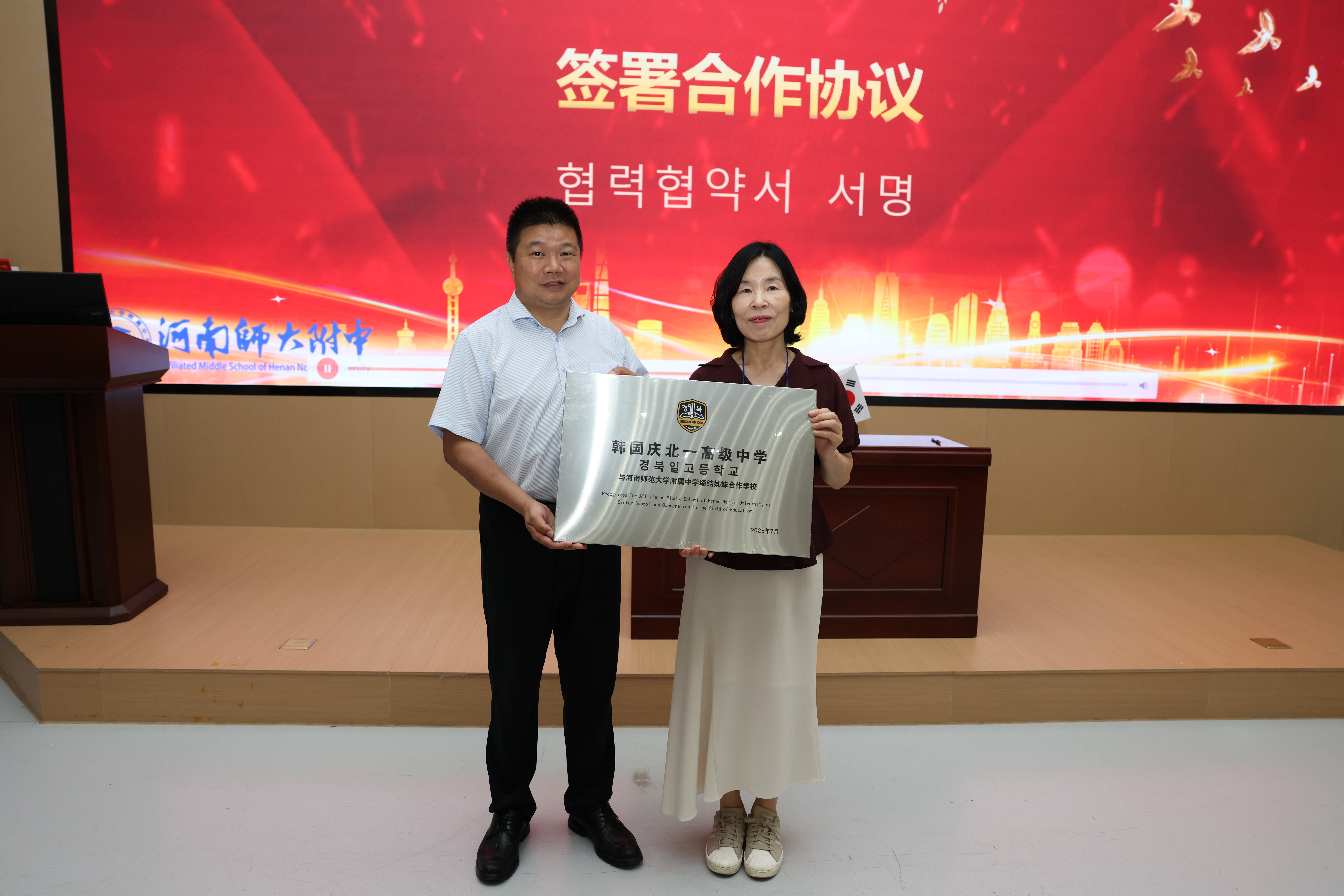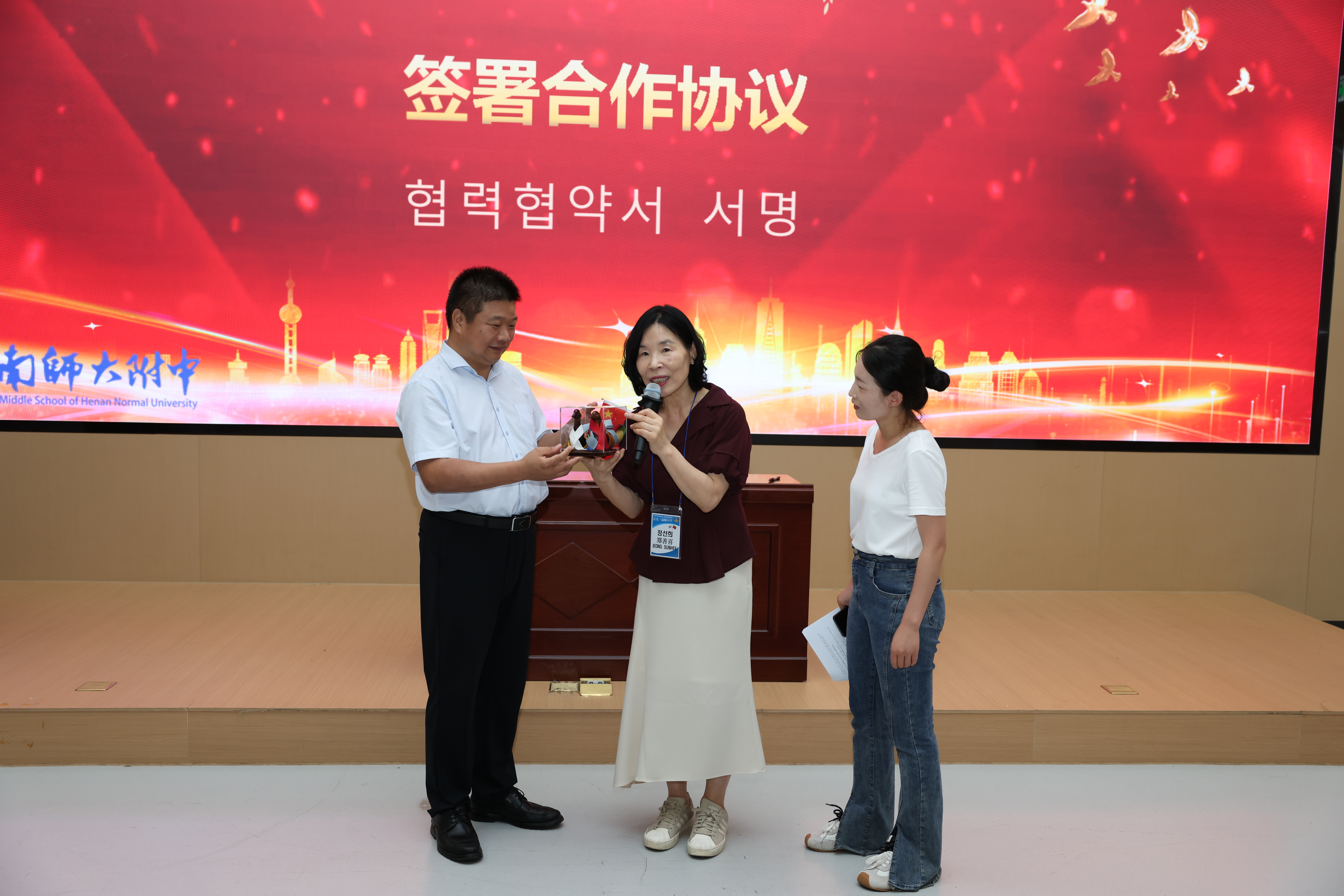 河南师范大学附属中学校长李杰明代表学校向韩国庆北一高级中学师生致以热烈欢迎,他提到:“河南师范大学附属中学与韩国庆北一高级中学正式缔结为姊妹学校,这不仅是两校交往史上的一座重要里程碑,更是面向未来,携手擘画教育新篇的战略起点。衷心期望, 两校的同学们能够珍惜这份跨越国界的缘分,积极投身交流,不仅成为知识的探索者,更要成为中韩友好的坚定使者、文化互鉴的积极桥梁。”
