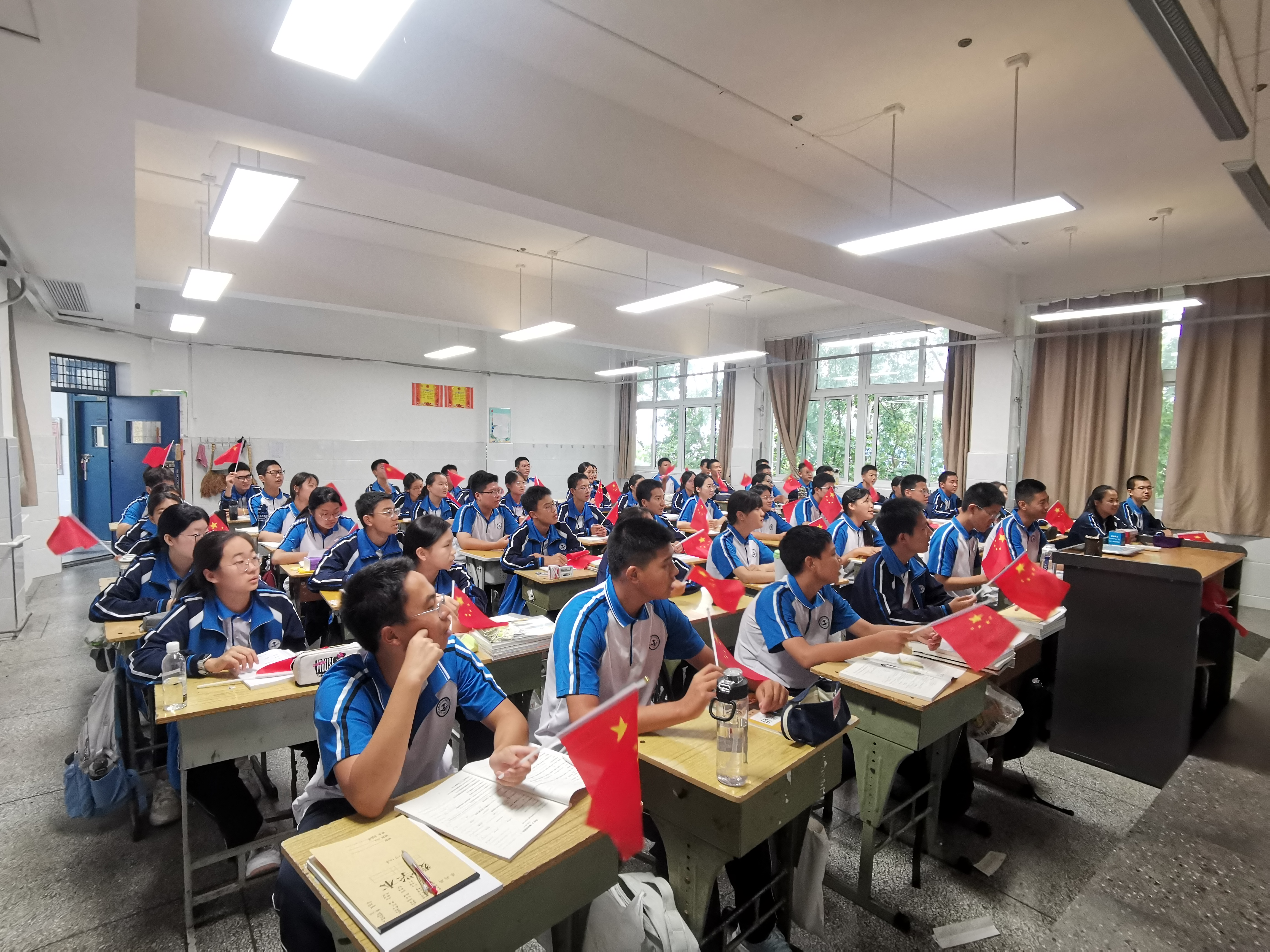 阅兵仪式开始前,各班师生肃立,面向屏幕同步跟唱国歌,歌声铿锵有力,与北京同频共振。随后,全体同学高举国旗,齐声合唱《歌唱祖国》,昂扬旋律提振士气。观看全程,同学们坐姿端正、全神贯注,在阅兵的庄严氛围中,深切感受国家力量与青年担当。