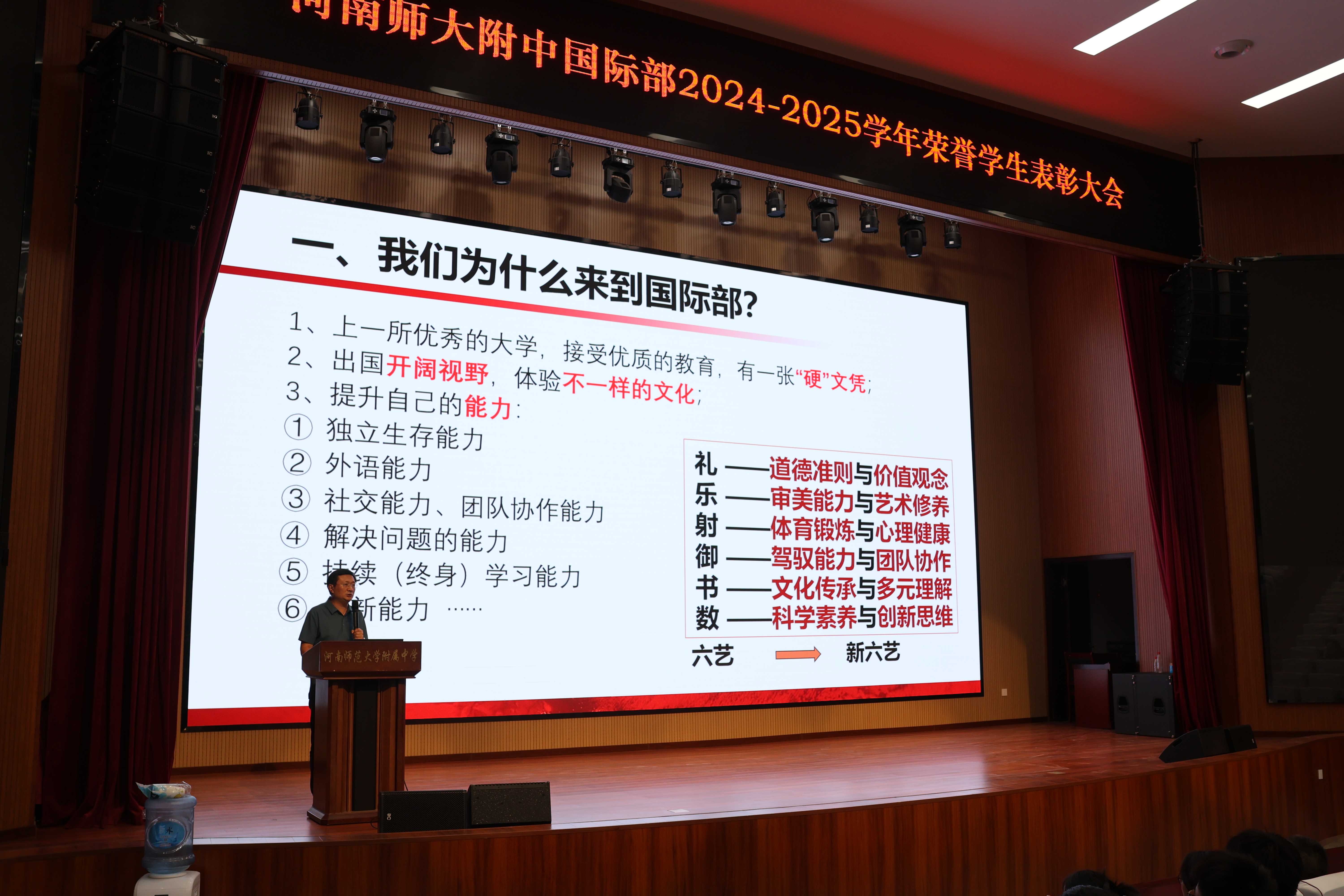 最后,国际部副主任周睿致辞。他围绕“我们为什么要来到国际部,我们要成为什么样的人和我们如何实现自己的目标”三方面展开主题分享。同时,周睿主任寄予了“天道酬勤,力耕不欺”的殷切期望,鼓励全体学子以获奖同学为榜样,在国际部的沃土上持续深耕,收获累累硕果,绽放更耀眼的光芒。