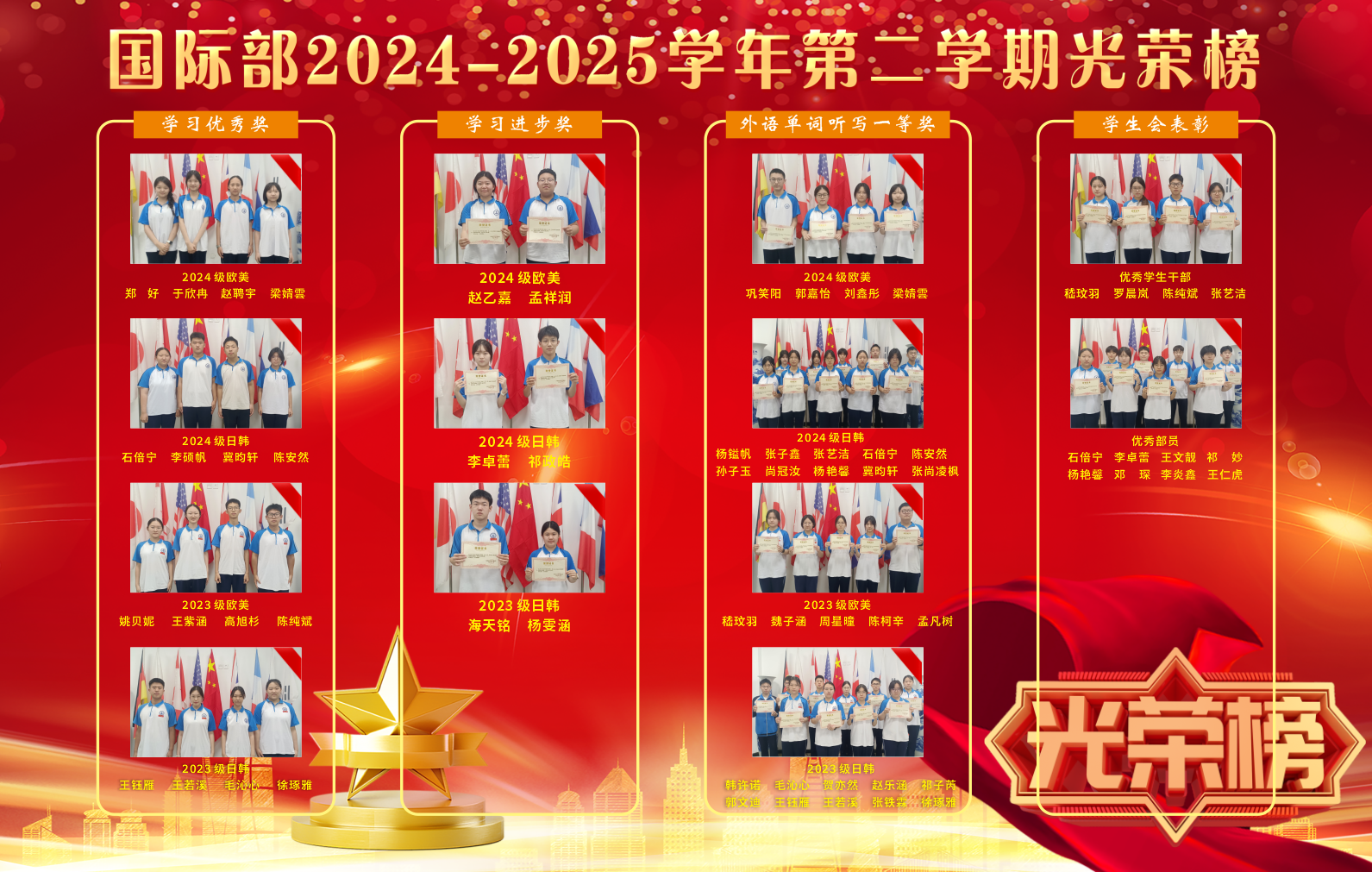 大会还宣读了2024-2025学年国际部学习优秀奖、学习进步奖、外语单词拼写优秀奖及学生会表彰名单。赵聃宇、石倍宁等数十名同学上榜,涵盖欧美、日韩多个班级,全面展现了国际部学子的多元风采。