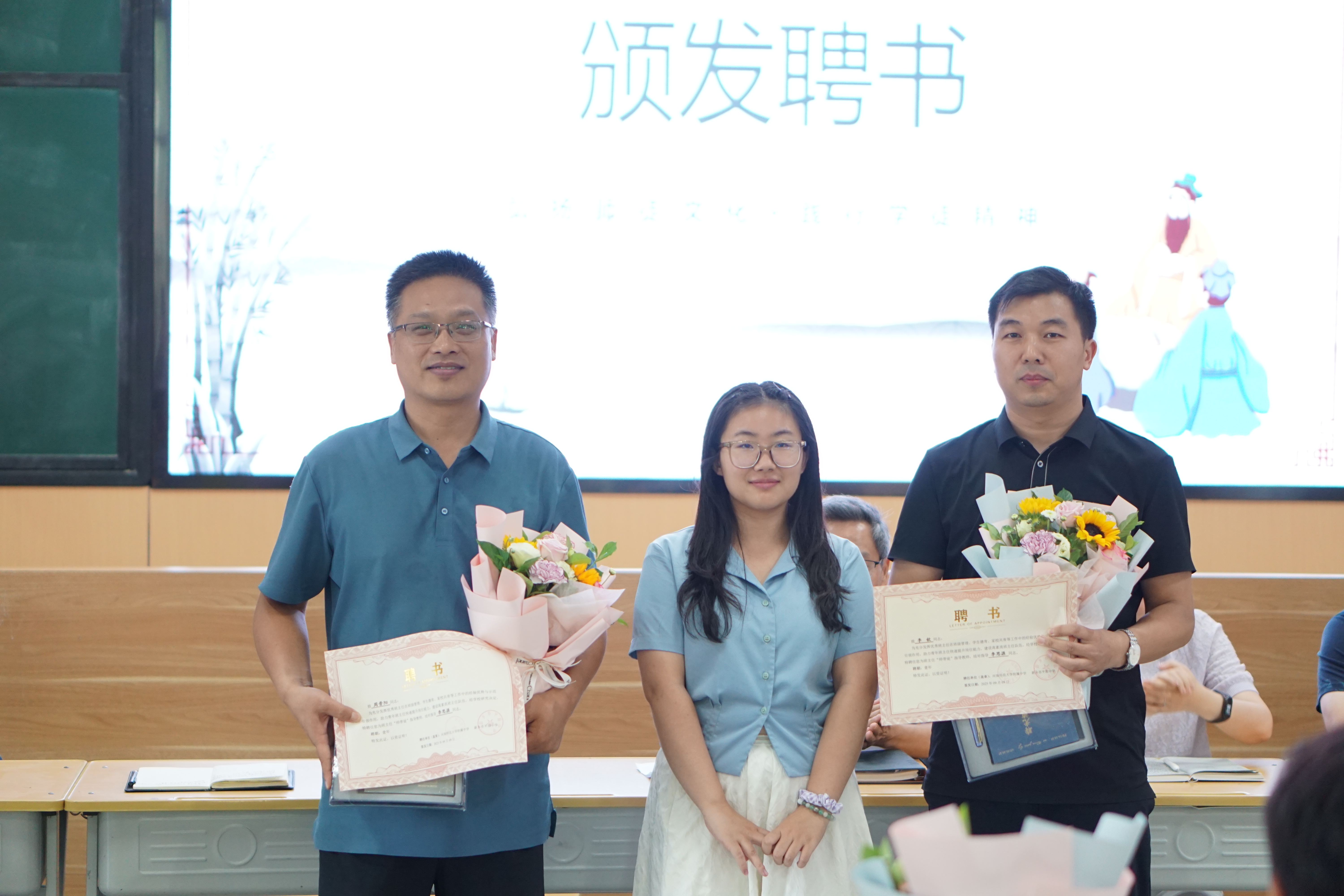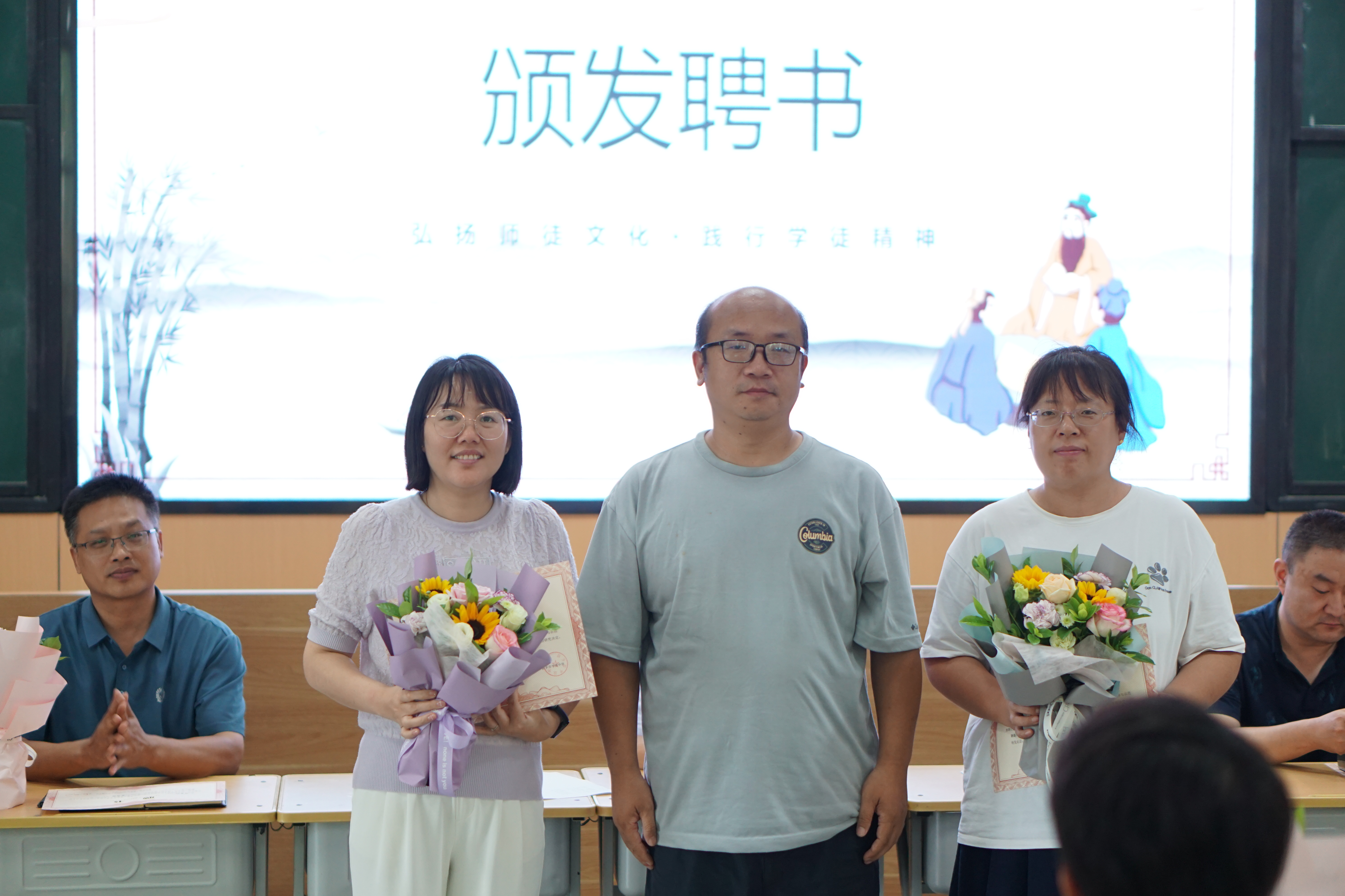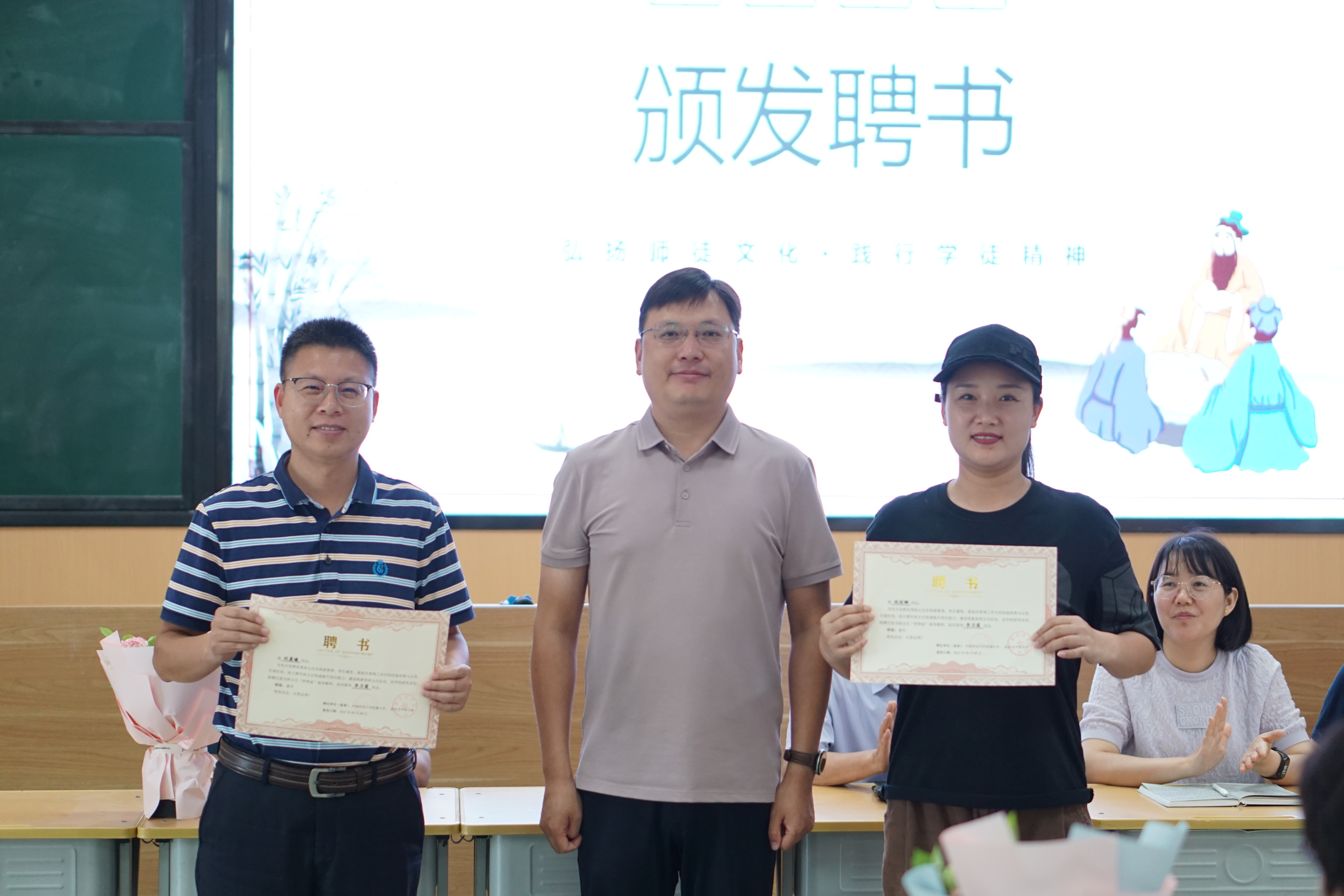 段世宇为指导教师颁发聘书,一份份聘书既是担当也是希望,承载着学校的期盼与信任!第一指导教师代表周晋阳发言,希望师傅们将积淀的育人智慧、崇高的师德师风传授给徒弟们,徒弟们要多学习、多请教,勤学好问,在师傅的带领下快速成长。指导教师代表王欢老师分享的带班理念,赢得了热烈掌声。