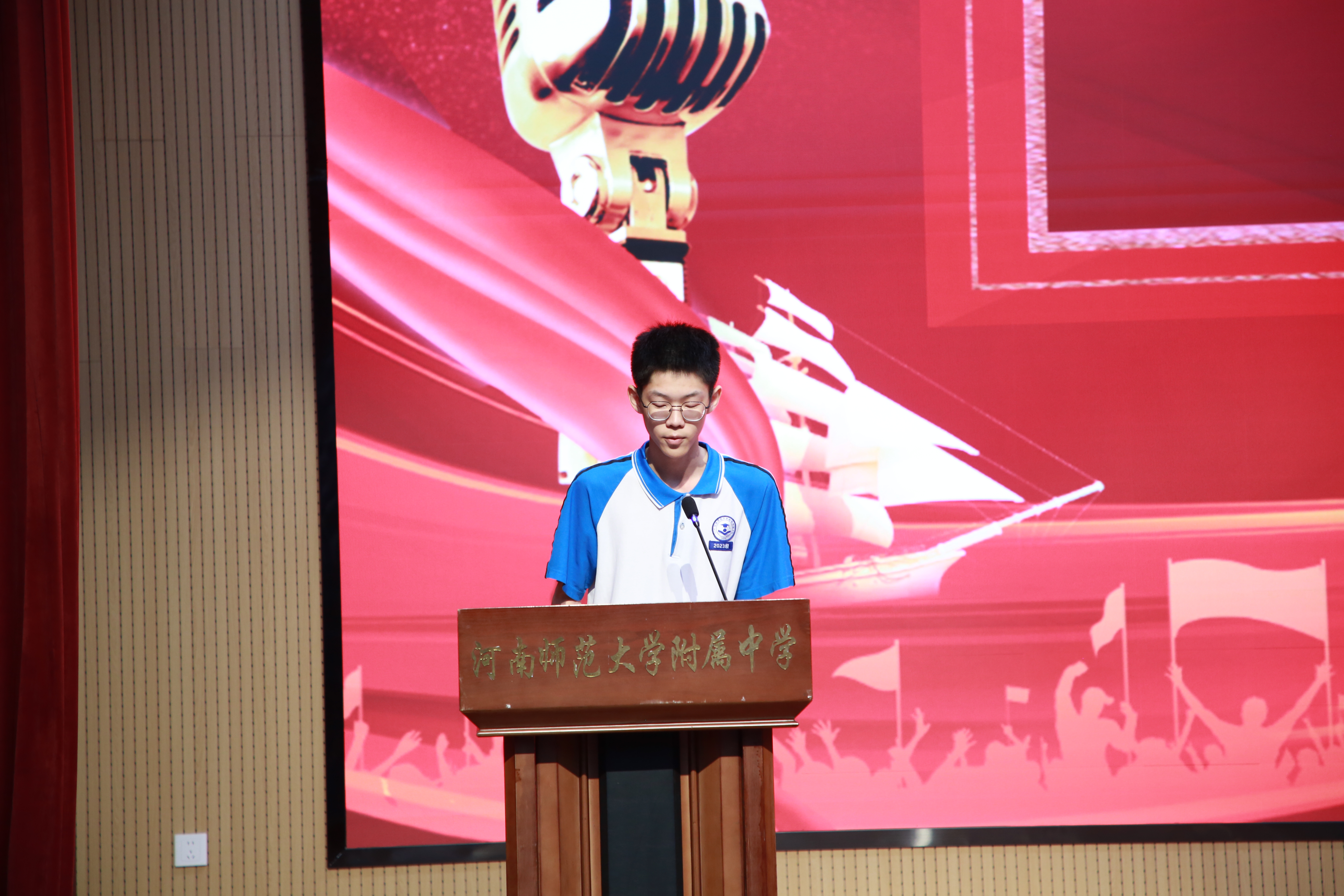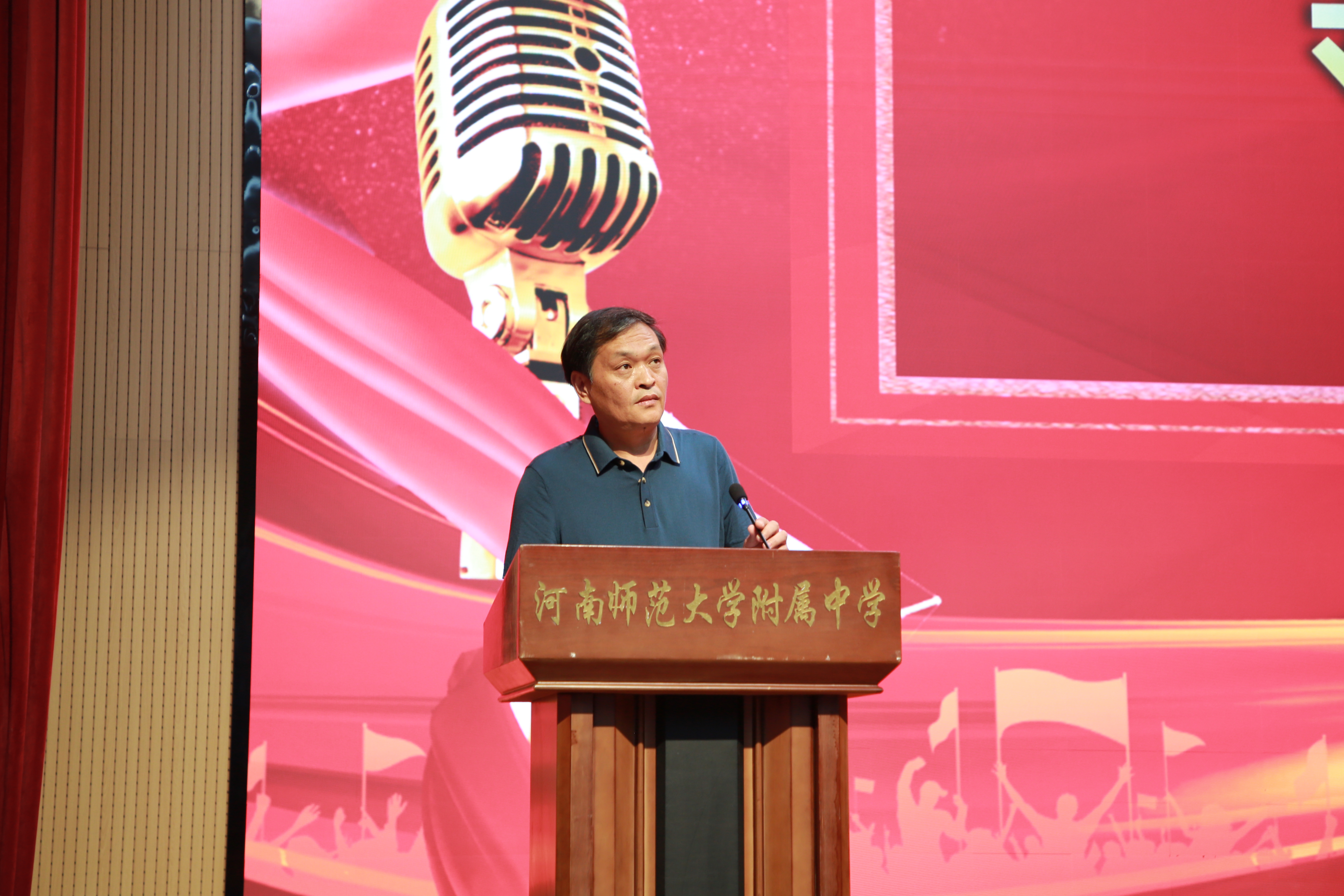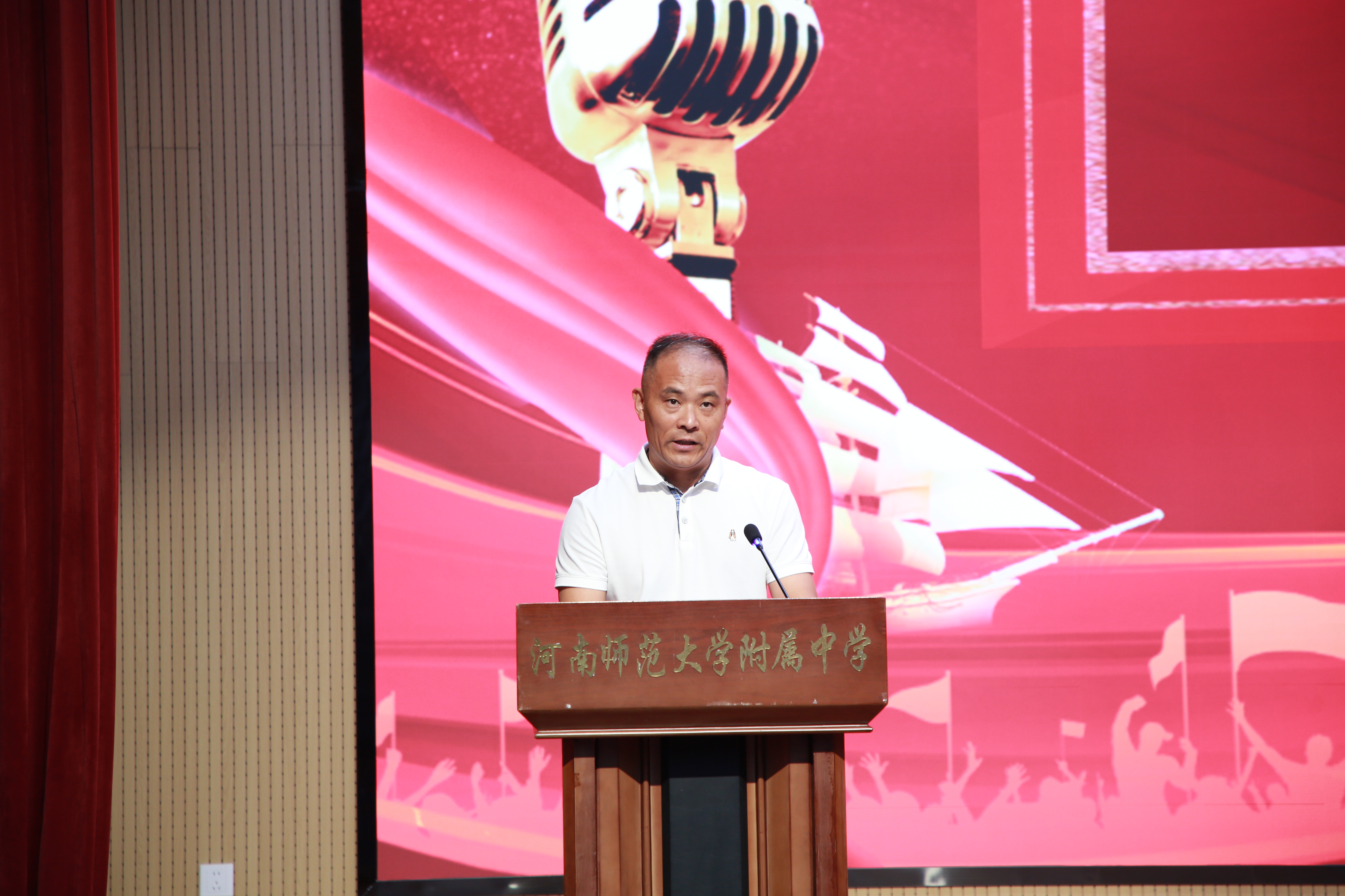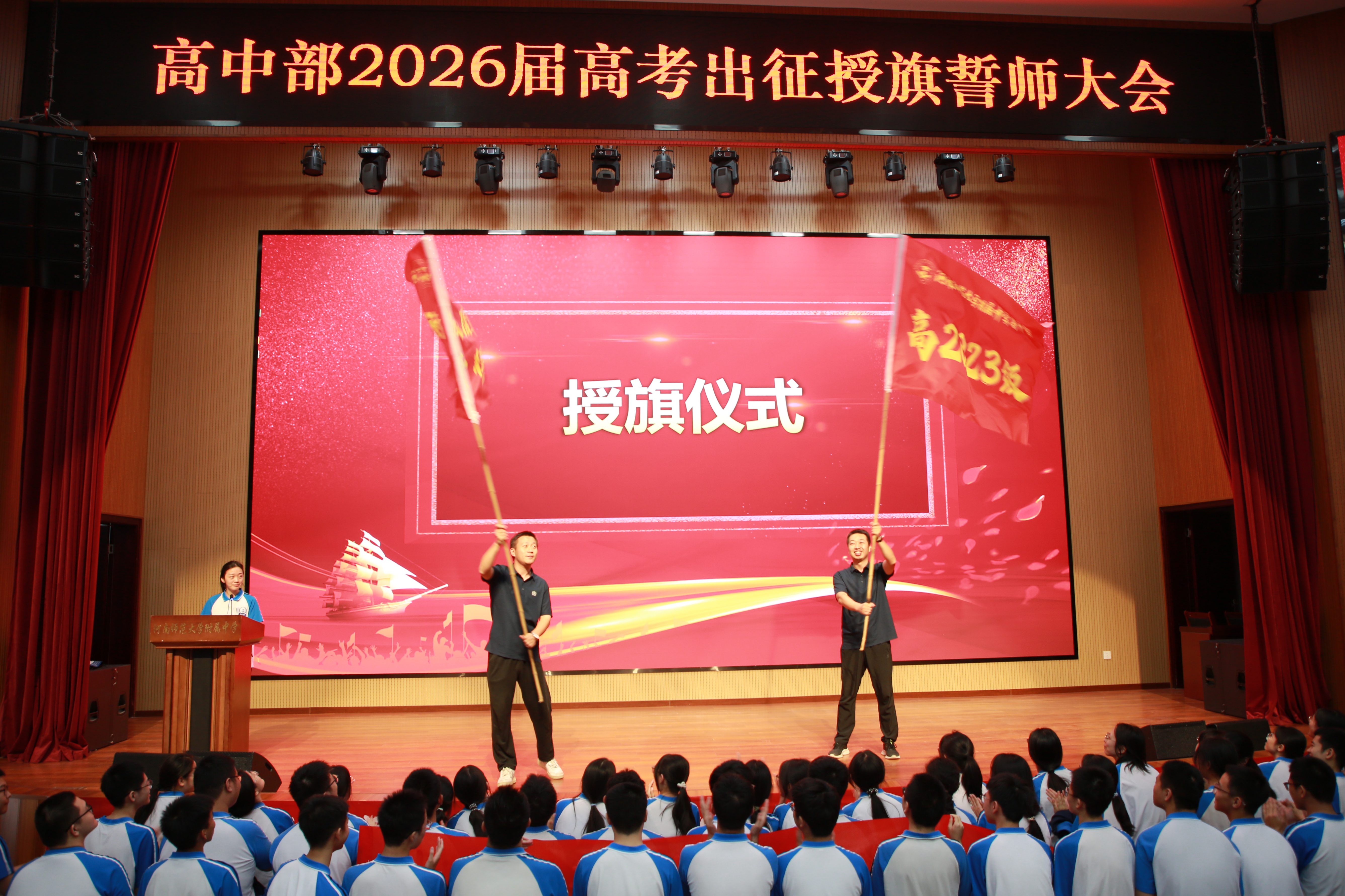 仪式的高潮是庄严的授旗环节。陈校长将象征着拼搏与胜利的“高三年级战旗”郑重授予年级主任郭兵、胡海波。他们接过战旗,奋力挥动,鲜红的旗帜迎风招展,瞬间点燃了全场的激情。