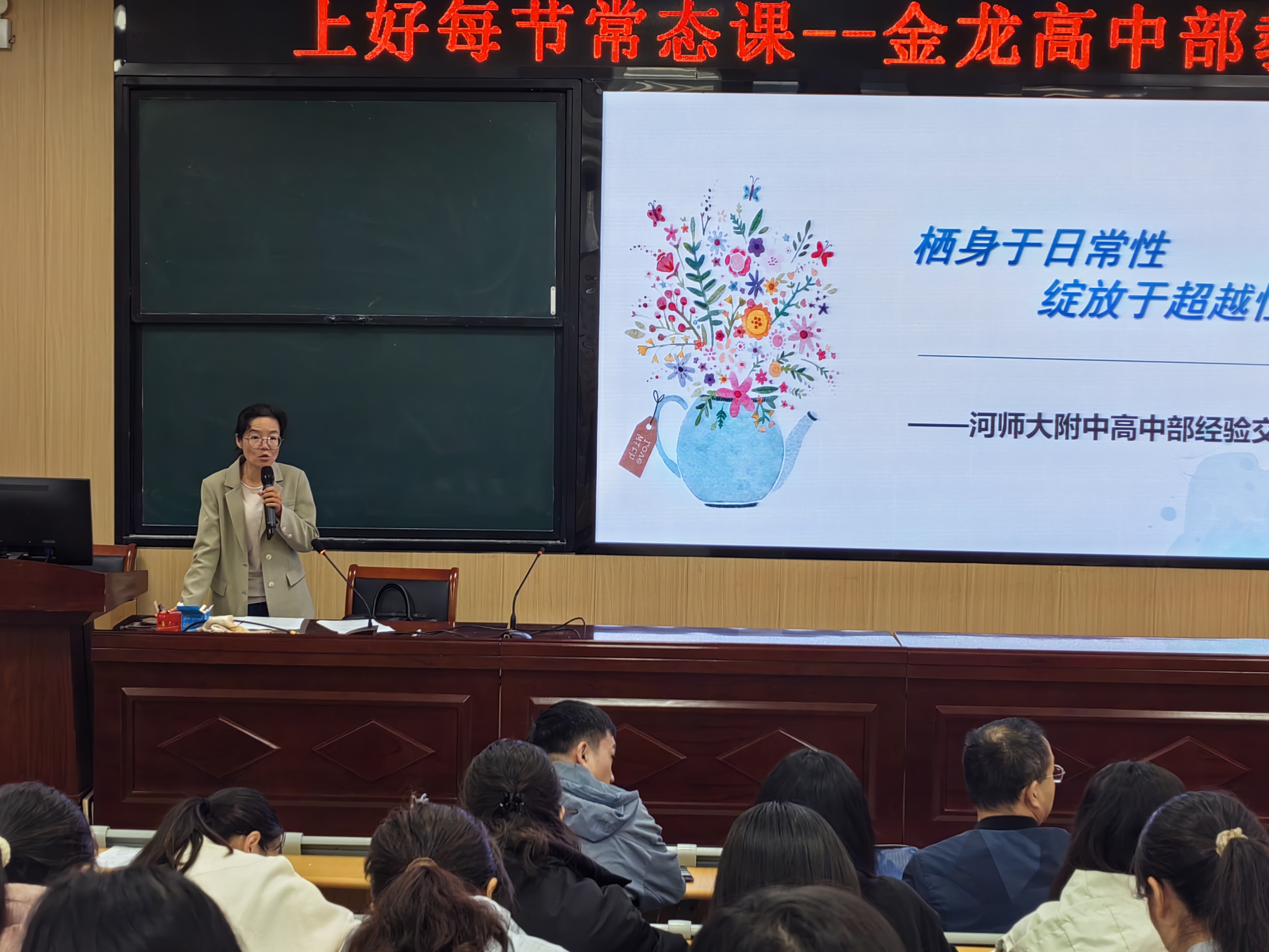 赵雪老师以语文课为例,围绕“守住常规课堂、开展特色活动”,从课堂常规与特色活动两方面阐述如何上好语文常态课,同时提及教育认知与反思。