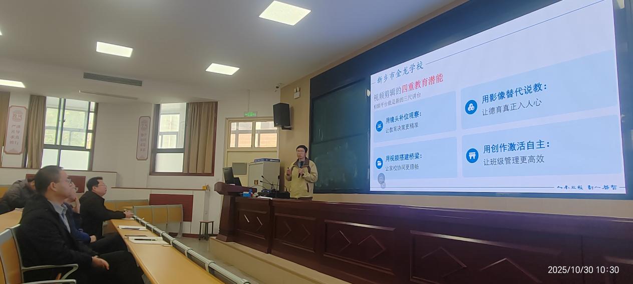 为探索班级管理新路径、激发学生成长内驱力,2025年10月29日,新乡市金龙学校高中部高一年级举办“镜头里的成长——视频剪辑激活班级新动能”主题分享活动。我校朱路路老师担任主讲人,为学校教师带来了一场别开生面的教育实践分享。