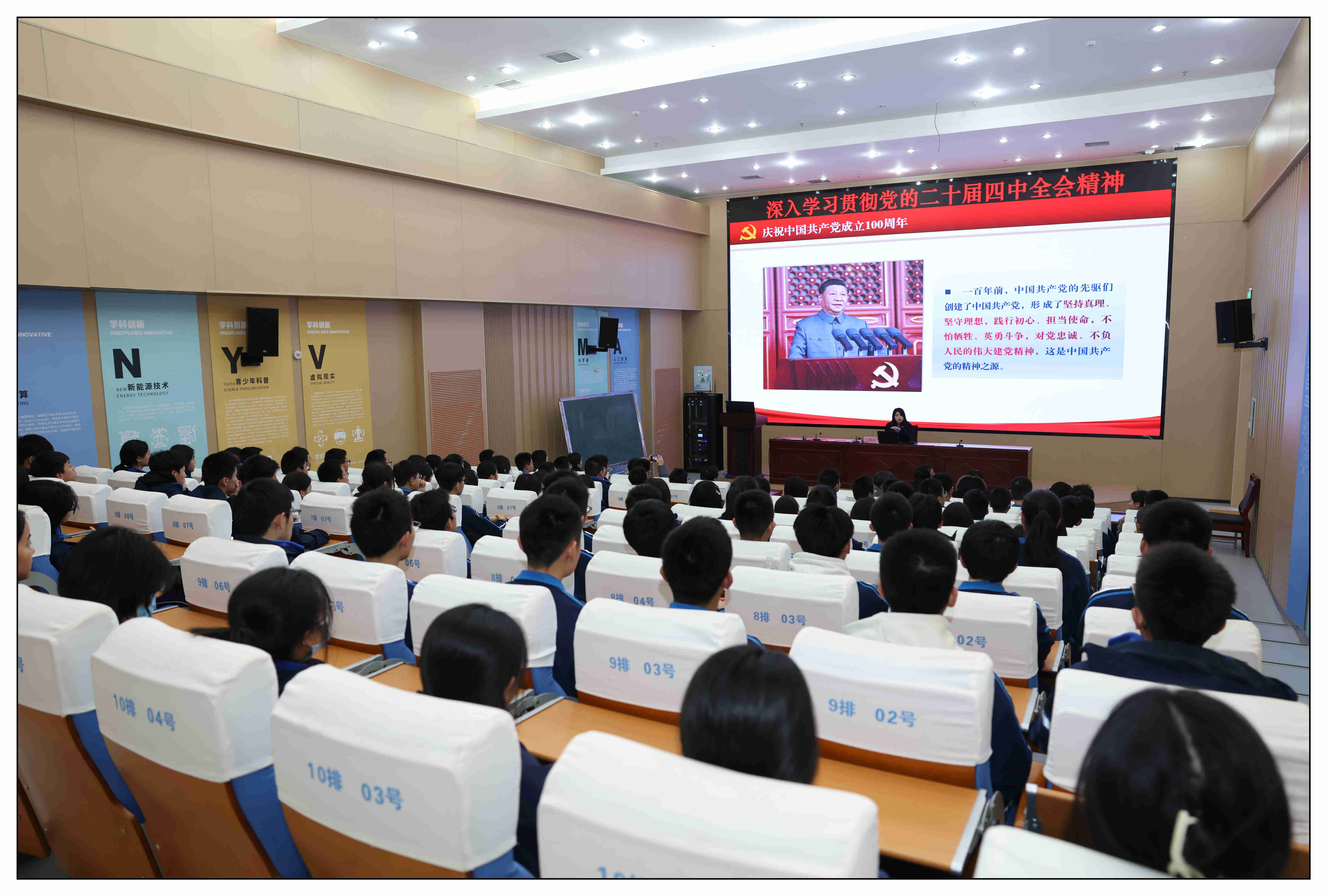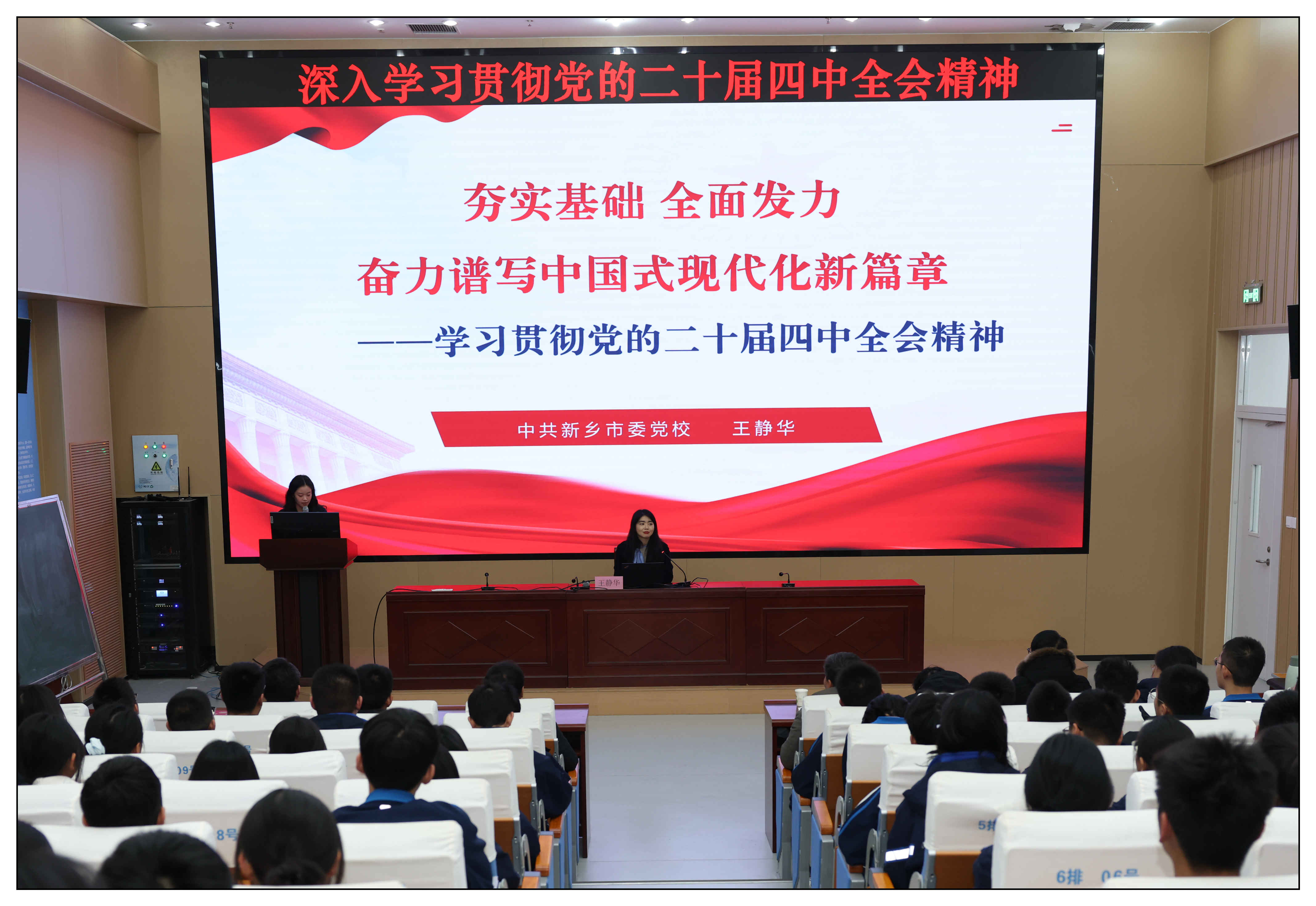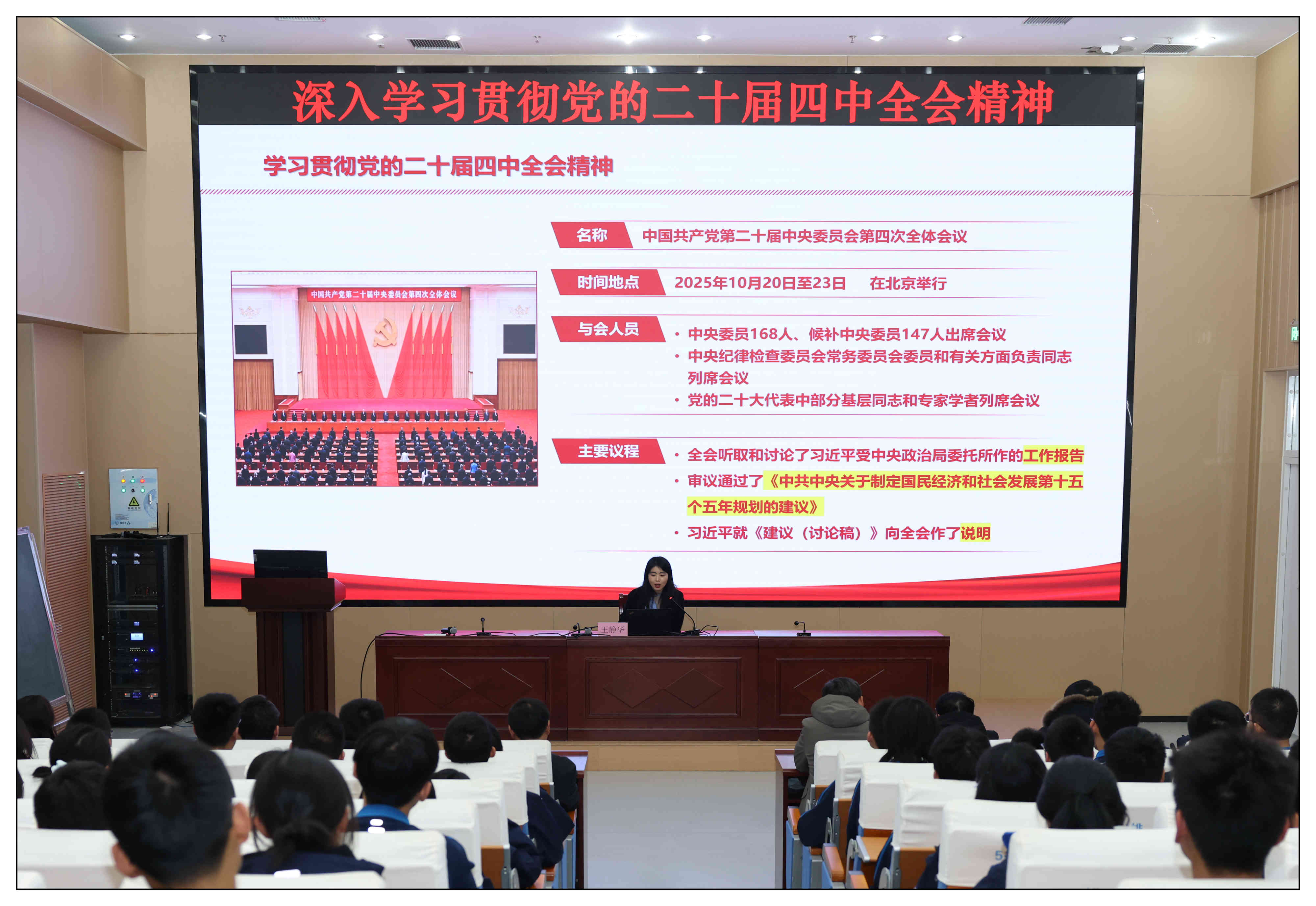 12月8日下午,我校在综合实验楼报告厅举行党的二十届四中全会精神暨“中国共产党人精神谱系”宣讲报告会。校党委副书记陈景任出席宣讲报告会,党委办公室负责人、高一年级师生代表120余人参加活动。报告会由李采薇老师主持。