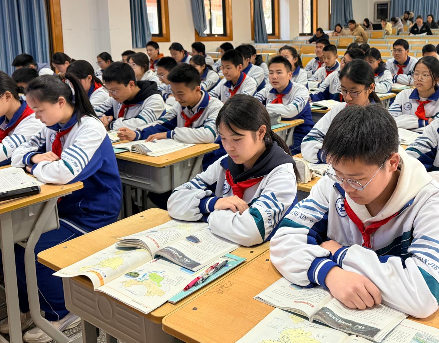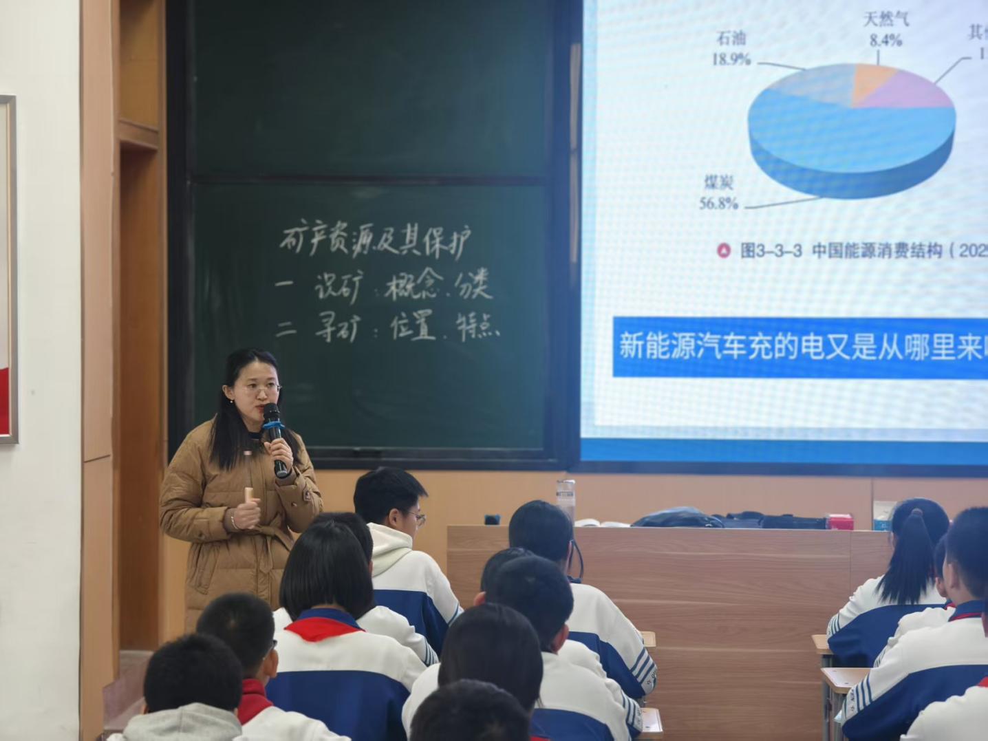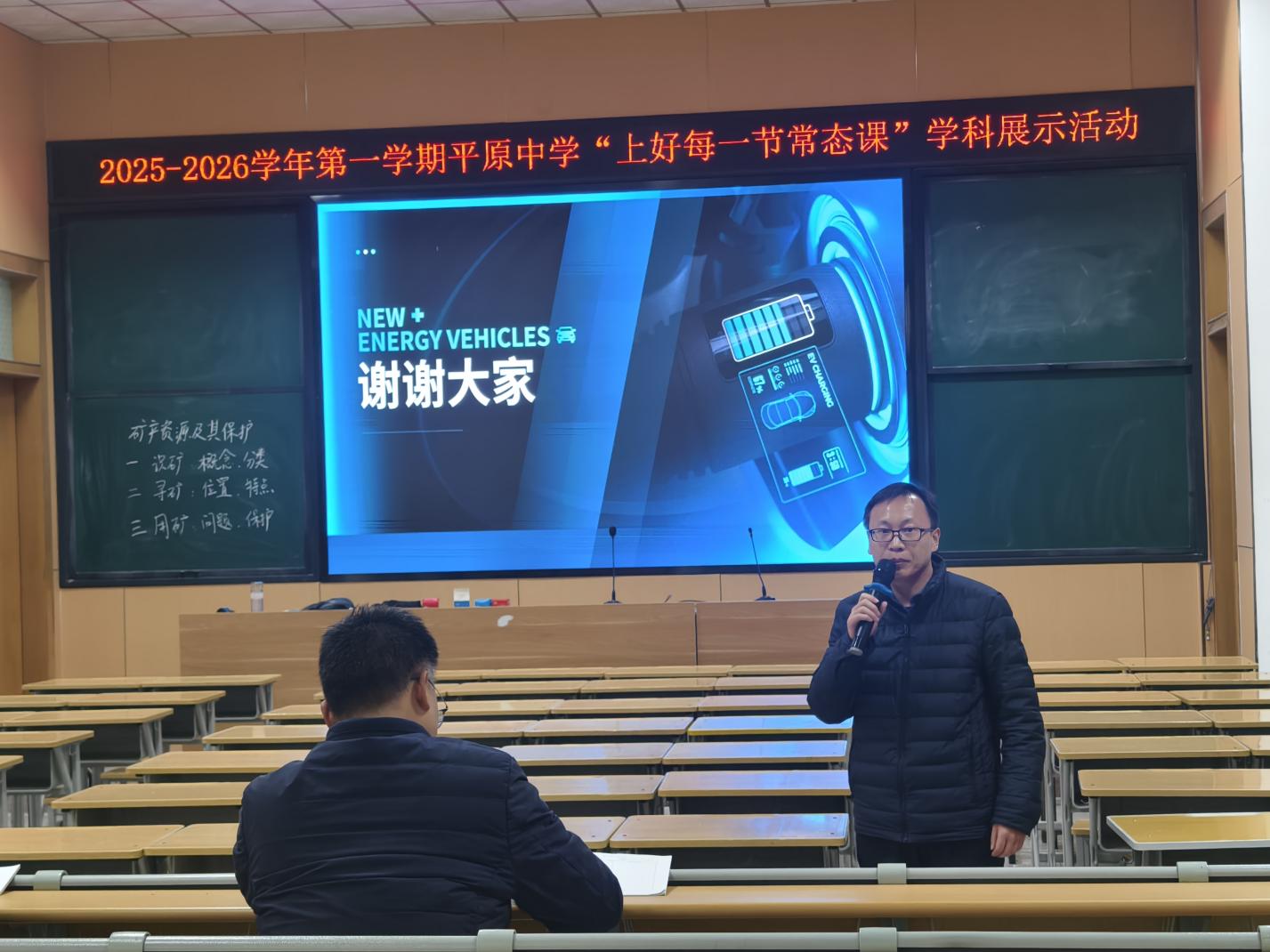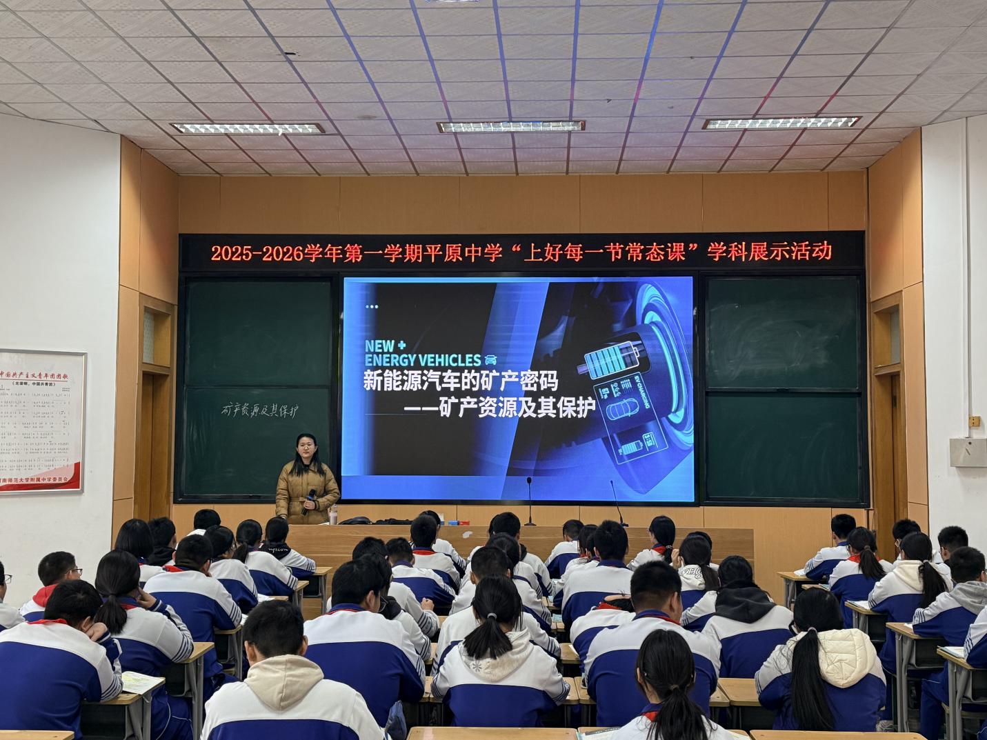 为深入贯彻落实市教育局关于"上好每一节常态课"的总体部署,深化课堂教学改革,提升学科教学质量,113日下午,平原中学2025-2026学年第一学期地理学科展示活动在西校区阶梯教室开展。地理组袁方老师以《矿产资源及其保护》为题,呈现了一堂兼具知识性、趣味性与思辨性的精彩课堂。河南师大附中副校长周晋阳,新乡市平原中学党总支书记刘志强,副校长段世宇、李沙沙,初中教育教学部副主任刘晨曦及全体初中教师到场观课。